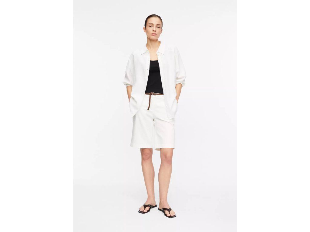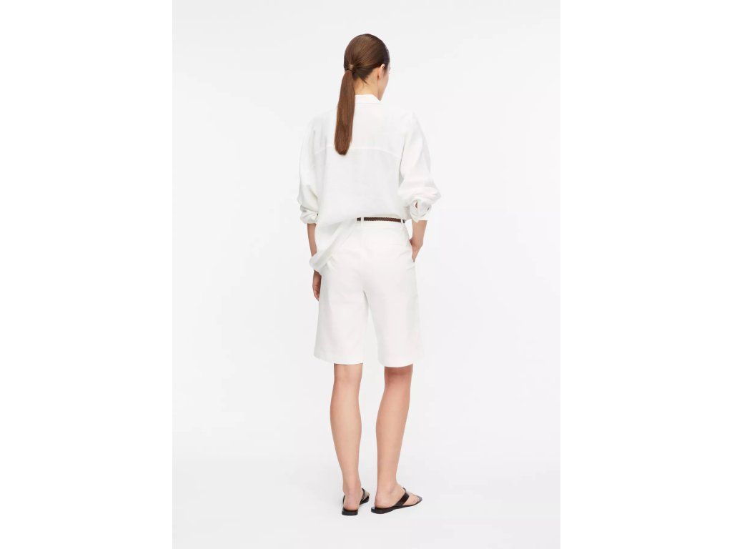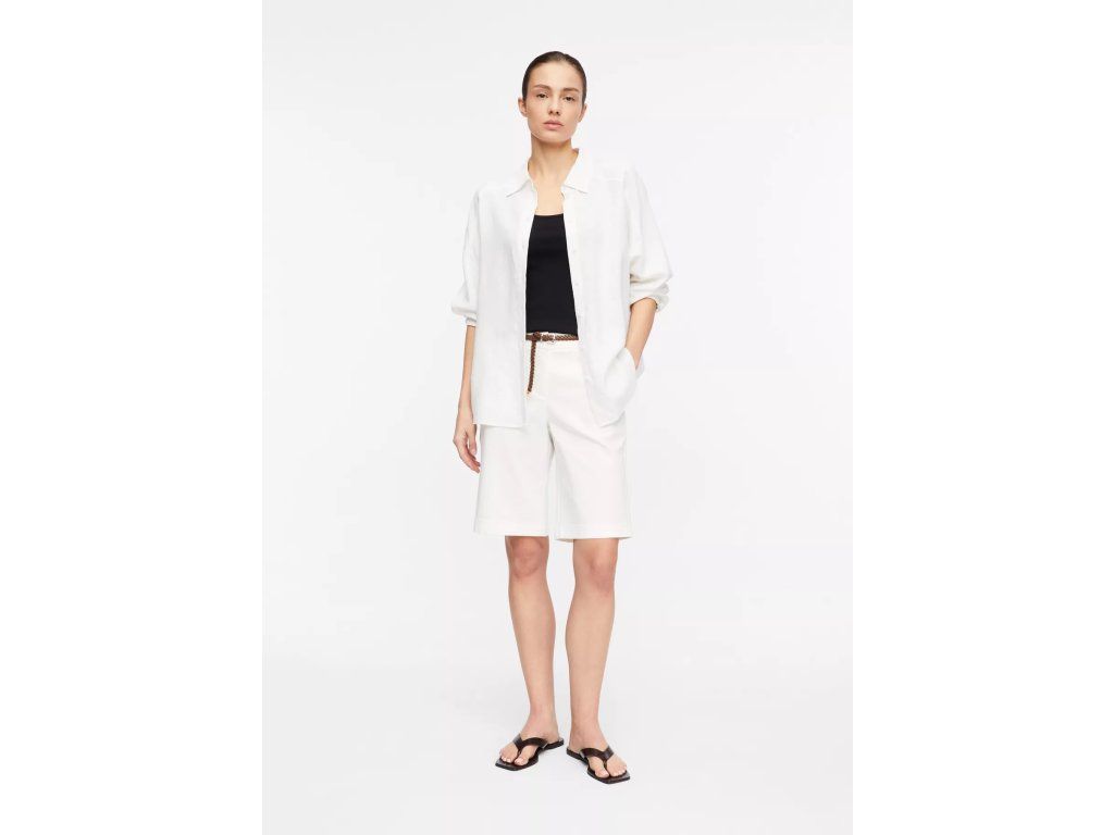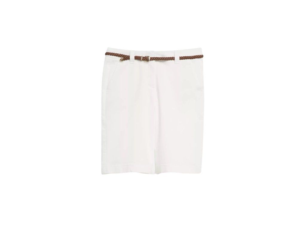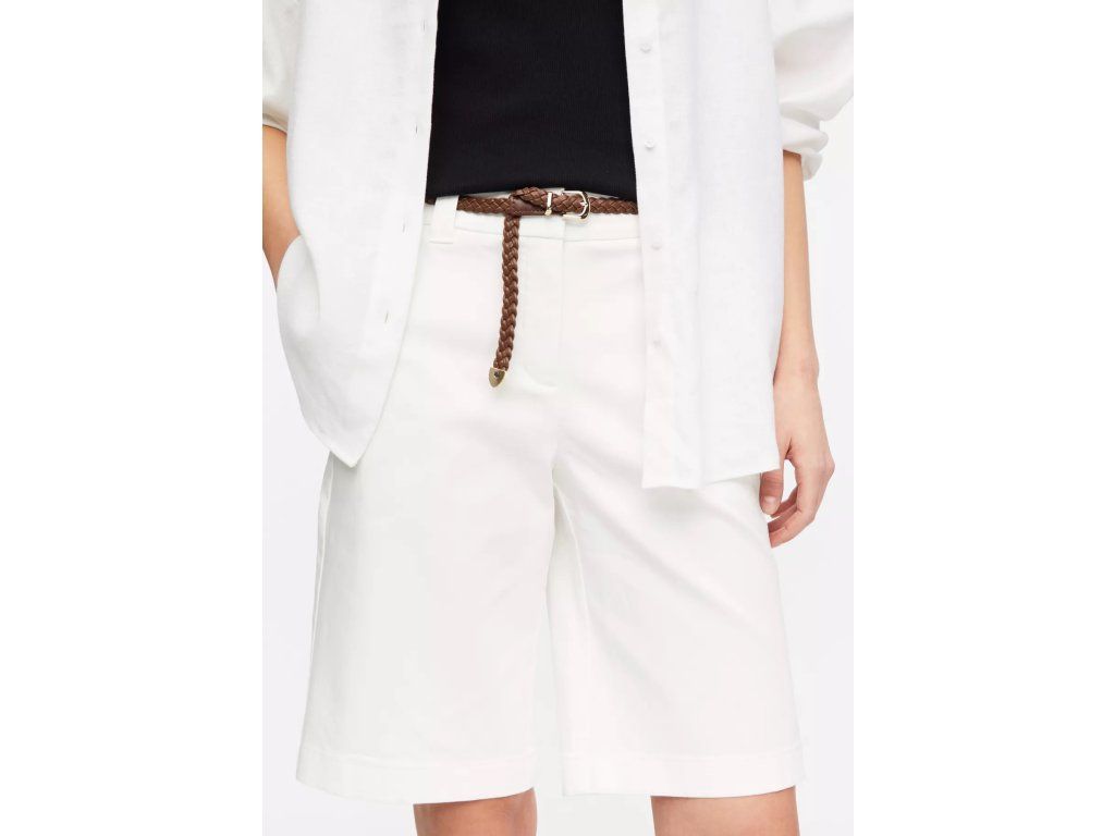 Dámské bermudy v elegantní světlé barvě představují ideální kombinaci pohodlí a nadčasového stylu. Minimalistický design doplňuje pásek v kontrastní hnědé barvě, který dodává outfitu zajímavý detail a zároveň umožňuje přizpůsobení v pase.
