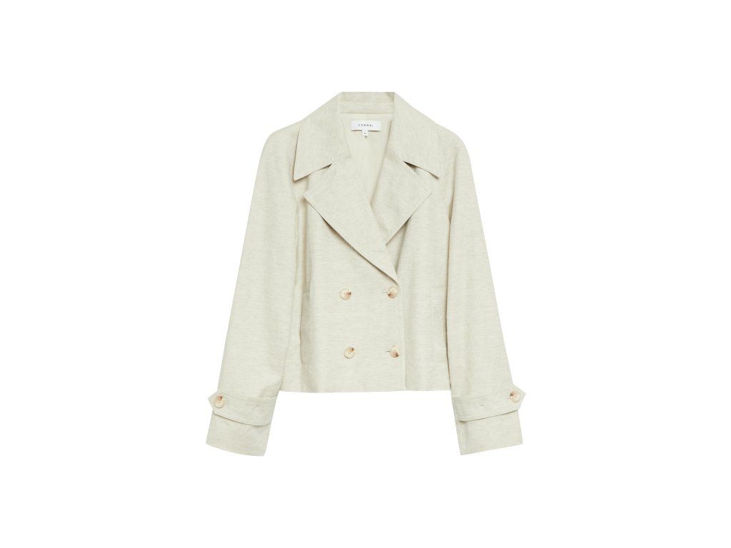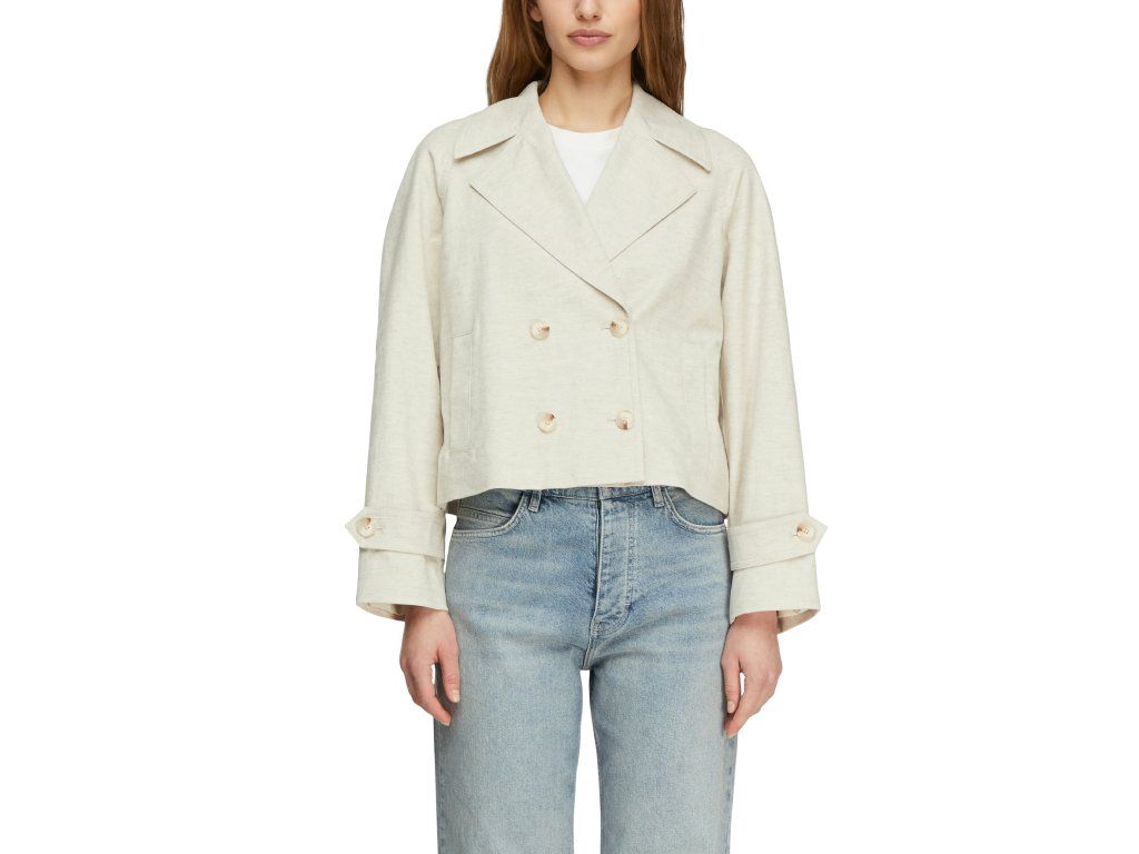 Dámská bunda v elegantním světlým odstínu je stylovým kouskem, který v sobě spojuje moderní střih a nadčasovou eleganci. Zkrácená délka dodává modelu svěží a současný vzhled, zatímco dvouřadé zapínání a výrazné klopy podtrhují jeho sofistikovaný charakter.