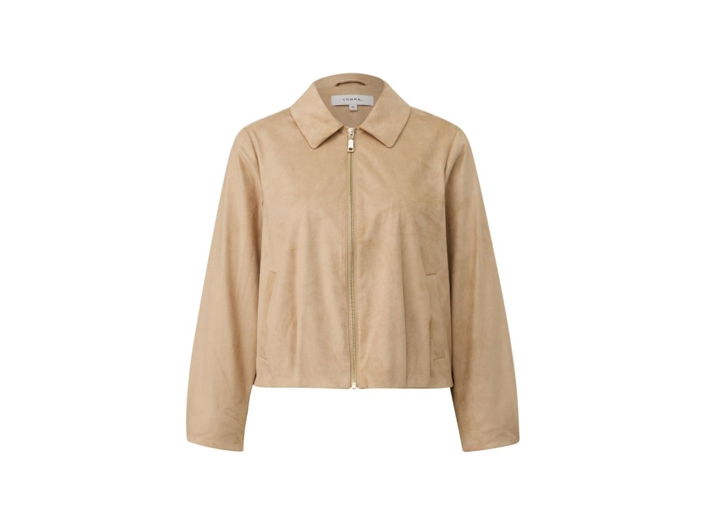 Stylová krátká bunda v jemném semišovém vzhledu, která dodá outfitu sofistikovaný a zároveň moderní charakter. Čistý střih s klasickým límcem působí nadčasově, zatímco zapínání na zip podtrhuje elegantní, ale ležérní styl. Měkký materiál s jemným povrchem je příjemný na dotek a pohodlný na nošení.