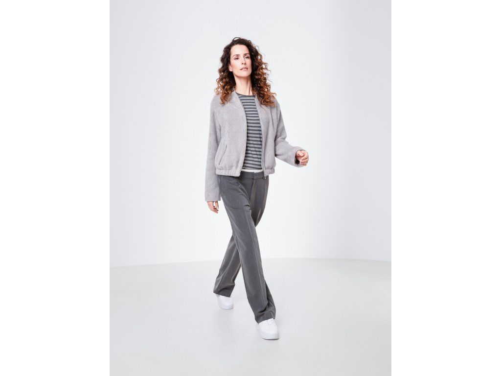 Dámská lehčí bunda na zip v neutrálním šedém odstínu je ideálním kouskem pro přechodné období. Strukturovaný materiál působí elegantně a zároveň sportovně ležérně. Kratší střih s kulatým výstřihem bez límce vytváří moderní siluetu a umožňuje snadné kombinování s kalhotami, sukní i šaty. Praktické kapsy na zip zvyšují funkčnost a pohodlí při nošení. Stylová bunda pro každodenní městský outfit.