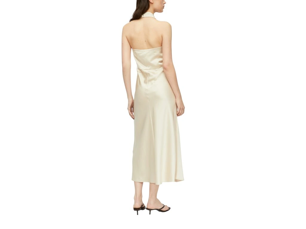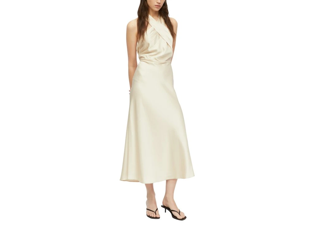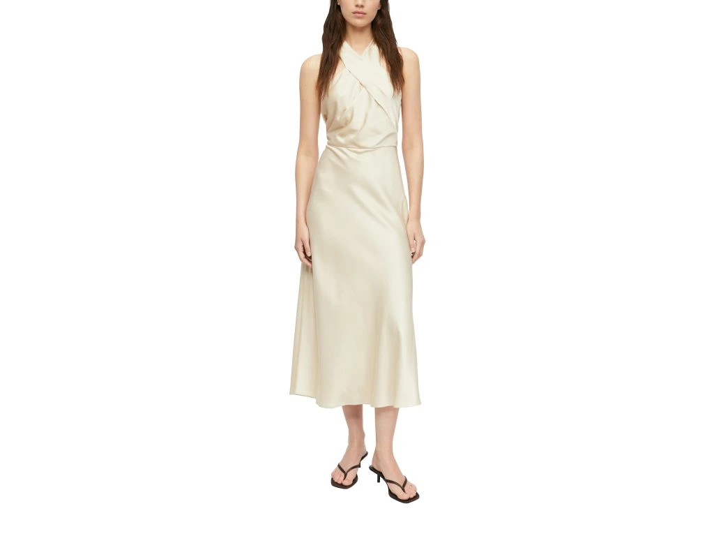 Elegantní dámské šaty v jemném krémovém odstínu zaujmou na první pohled svým sofistikovaným střihem a splývavým materiálem. Horní část s překříženými ramínky vytváří zajímavý detail, který podtrhuje ženskost a dodává modelu originální vzhled.