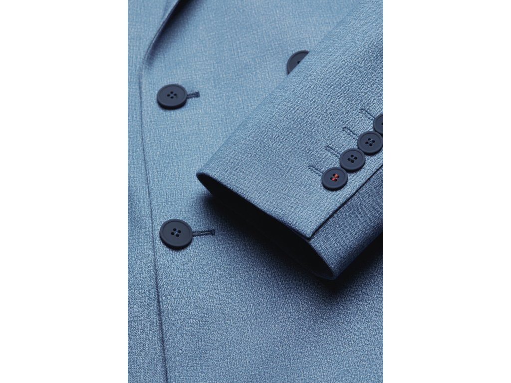 Dolaďte svůj outfit tímto pánským dvouřadým sakem v elegantní světle modré barvě. Moderní střih a jemná textura látky zaručují nadčasový vzhled, který se hodí pro obchodní schůzky, společenské události i stylové volnočasové kombinace. Dvouřadé zapínání s kontrastními knoflíky, klopový límec a dvě přední kapsy s klopou dodávají saku sofistikovaný charakter.