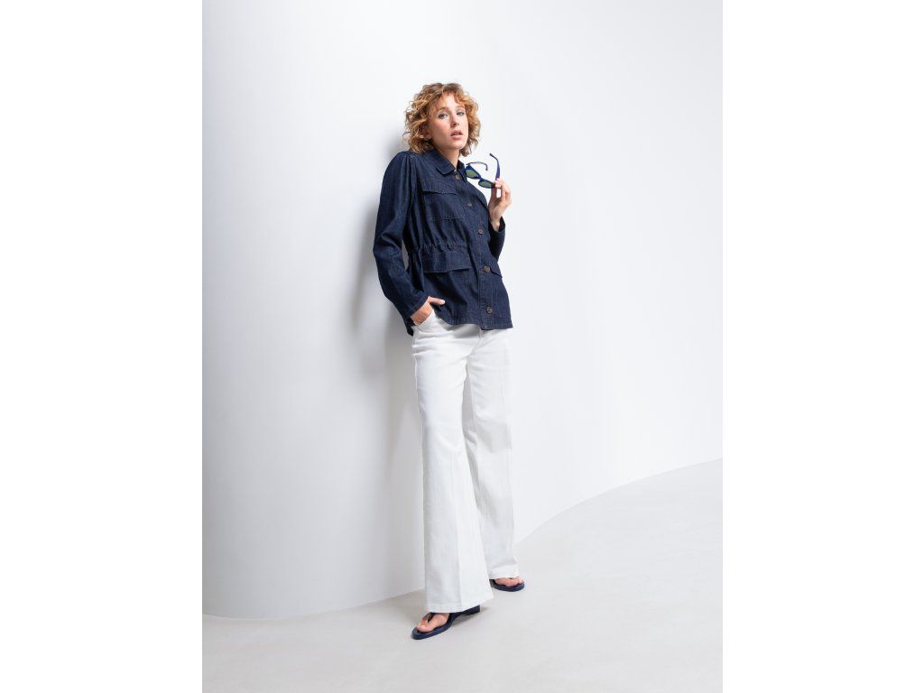 Model je vybaven klasickým límečkem, zapínáním na knoflíky po celé délce a výraznými kapsami – dvě náprsní s klopou a dvě spodní našité kapsy, které dodávají bundě lehce safari nádech. Pevnější denimový materiál drží tvar a zároveň poskytuje pohodlí při nošení.