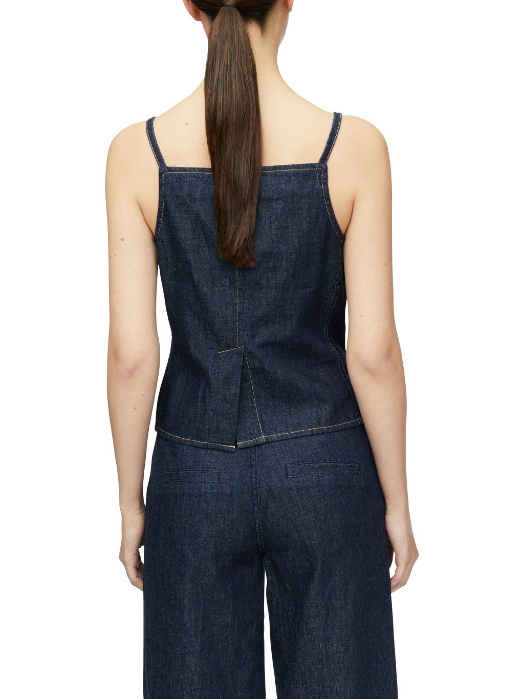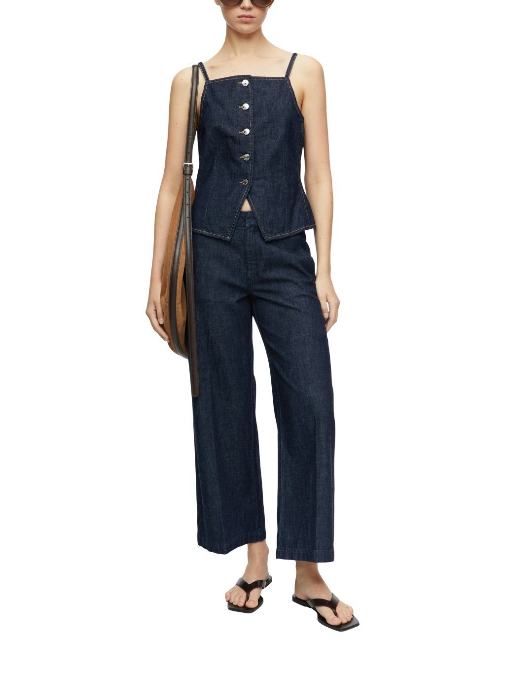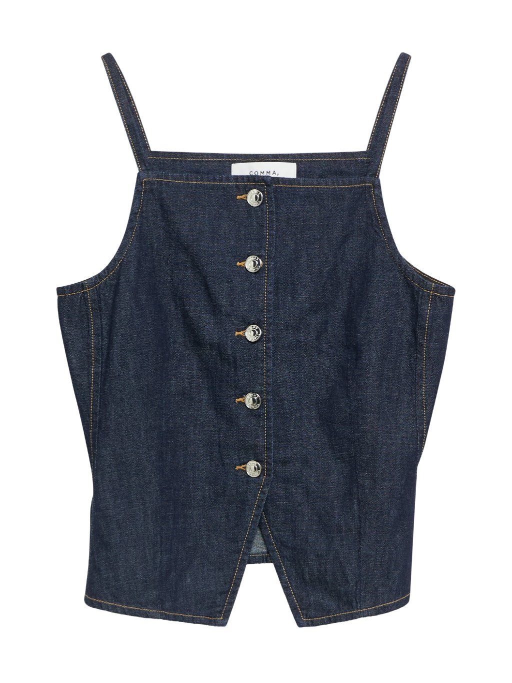 Džínový top na ramínka v tmavě modrém odstínu představuje stylový a moderní kousek pro letní outfity. Pevnější denimový materiál drží tvar a zároveň působí ležérně i nadčasově.