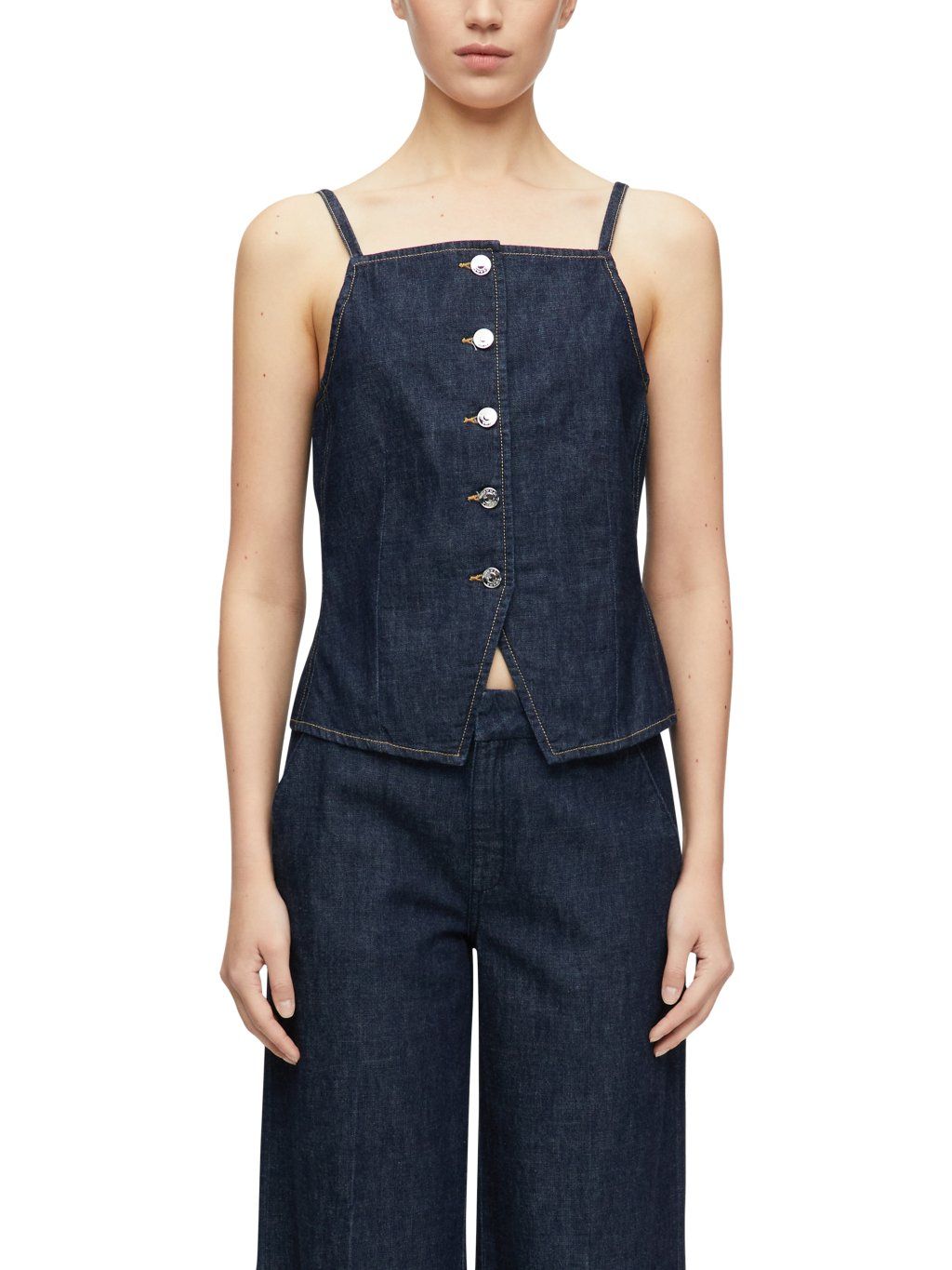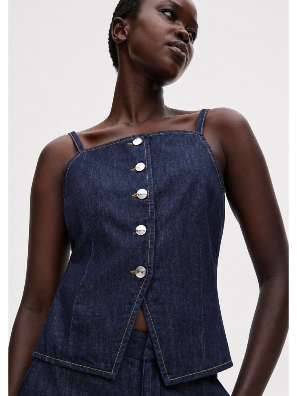 Top zaujme hranatým výstřihem a úzkými ramínky, které zvýrazňují ramena. Přední zapínání na knoflíky dodává modelu výrazný detail a usnadňuje oblékání. Mírně projmutý střih lichotí postavě, zatímco rozparek ve spodní části přidává na originalitě a pohodlí při nošení.