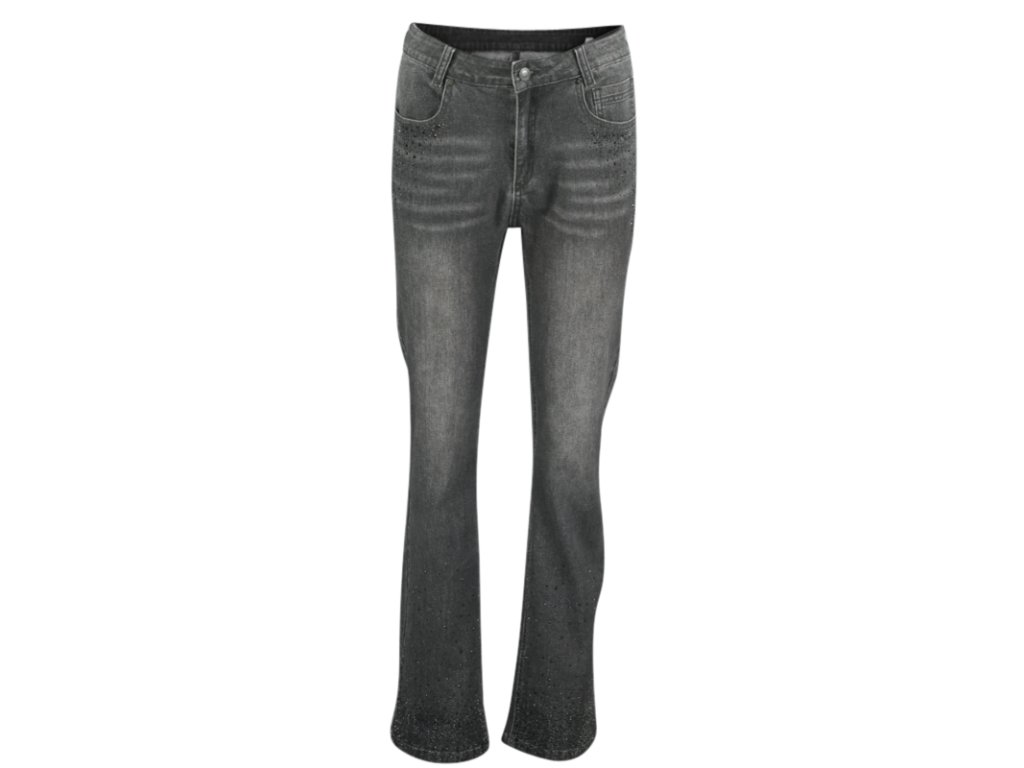 Stylové dámské džíny v moderním šedém odstínu, které kombinují klasický denimový vzhled s trendy siluetou. Střih s lehce rozšířenými nohavicemi od kolen dolů opticky prodlužuje nohy a vytváří ženskou, vyváženou siluetu. Jemné vyšisování dodává džínům ležérní, městský charakter.