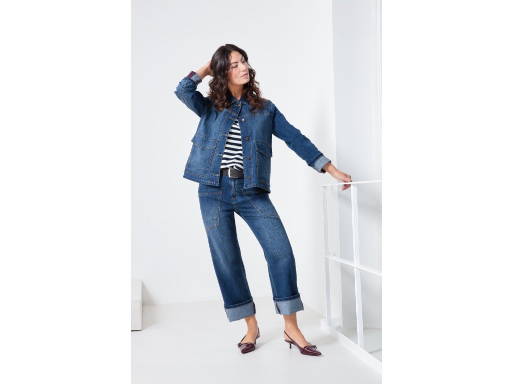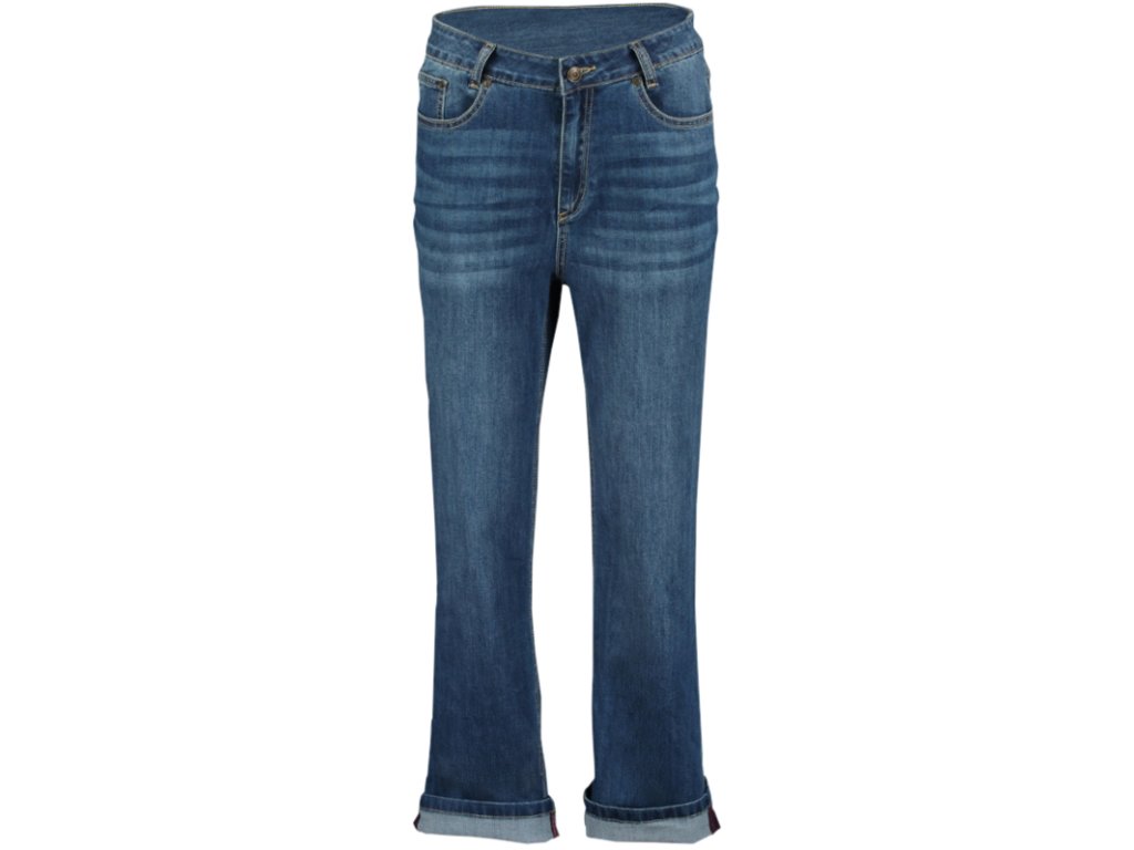 Dámské džíny v klasickém modrém denimu – pohodlný střih s lehce vyšším pasem a rovnými nohavicemi. Díky mírnému oprání v oblasti stehen působí svěže a lichotivě tvarují postavu. Praktické kapsy vpředu i vzadu doplňují klasický design. Nohavice jsou zakončené ohrnutým lemem, který outfitu dodává ležérní a moderní vzhled. Skvěle se hodí k volnočasovým outfitům s teniskami i k elegantnějším kombinacím s kotníkovými botami.