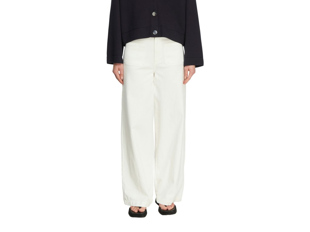 Vyšší pas s klasickým zapínáním na zip a knoflík krásně tvaruje postavu. Přední kapsy dodávají modelu jemně utilitární nádech a podtrhují jeho současný charakter. Pevnější, příjemný materiál drží tvar a zajišťuje komfort při nošení.