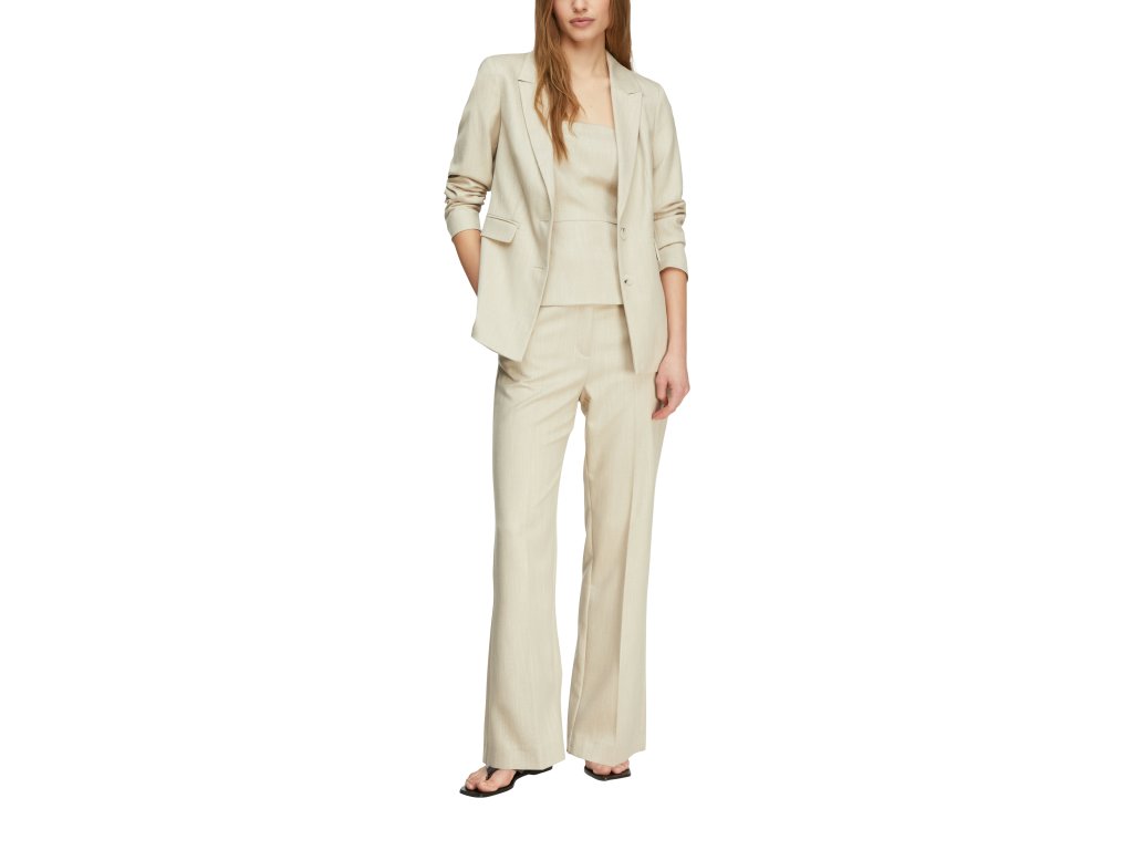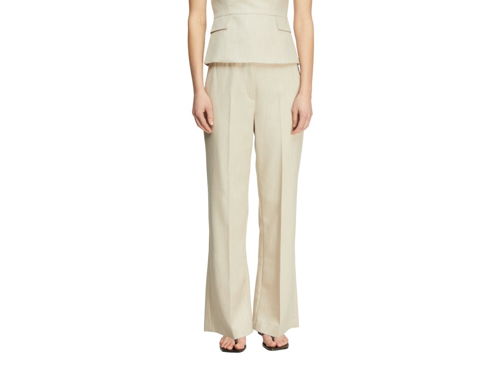 Elegantní dámské kalhoty v jemném béžovém odstínu představují nadčasový základ šatníku pro každou moderní ženu. Díky vysokému pasu a volně splývavému střihu s lehce rozšířenými nohavicemi krásně prodlužují siluetu a působí velmi sofistikovaně.