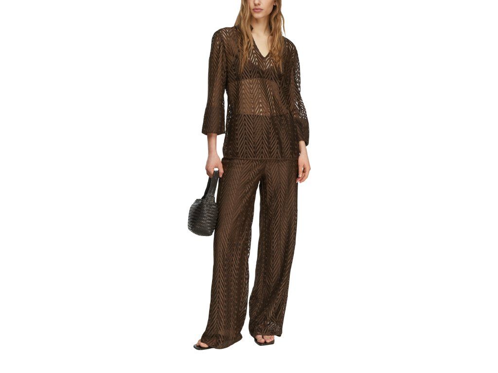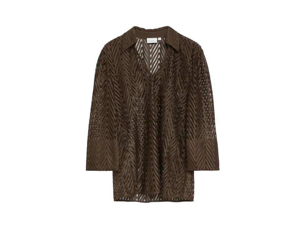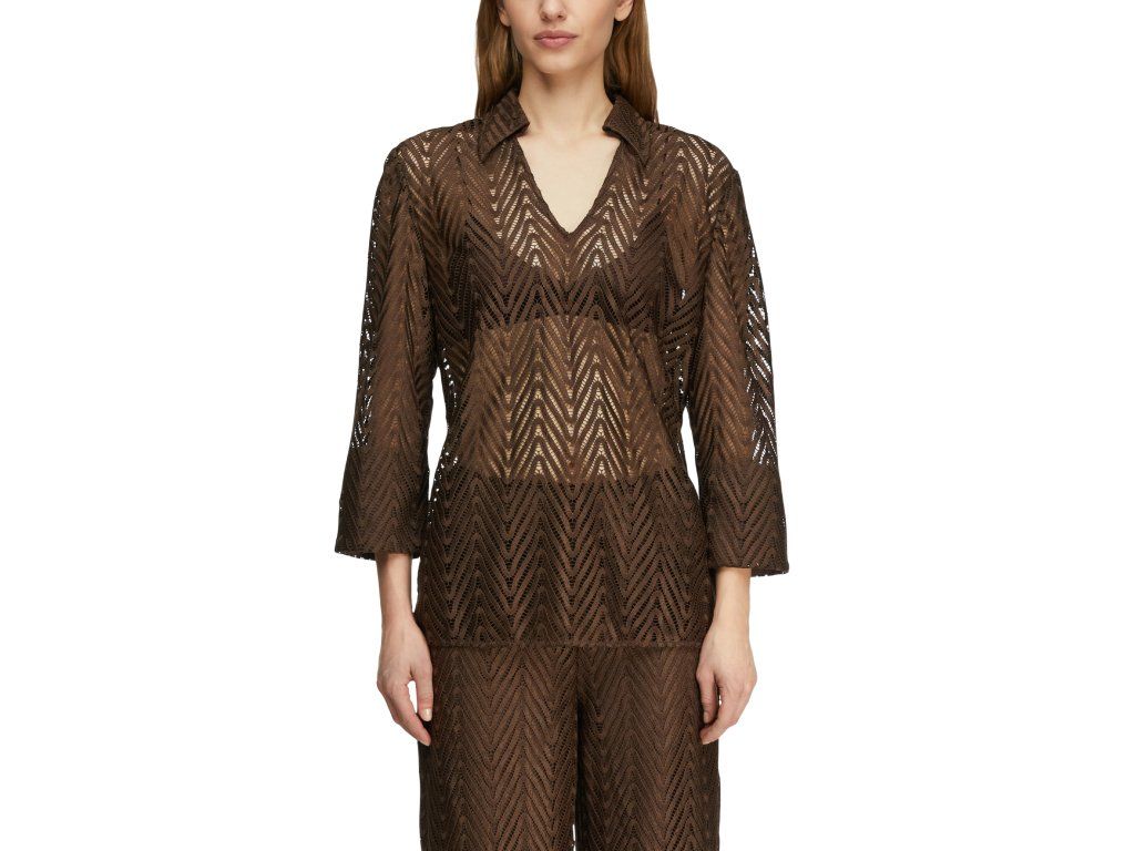 Dámská halenka v elegantním hnědém odstínu zaujme svým výrazným vzorovaným materiálem s jemnou transparentností, který dodává modelu smyslný a sofistikovaný vzhled. Decentní límeček a výstřih do V podtrhují ženskou siluetu, zatímco vzdušný střih zajišťuje pohodlí při nošení.