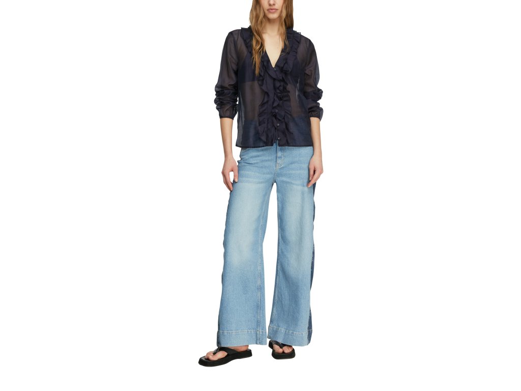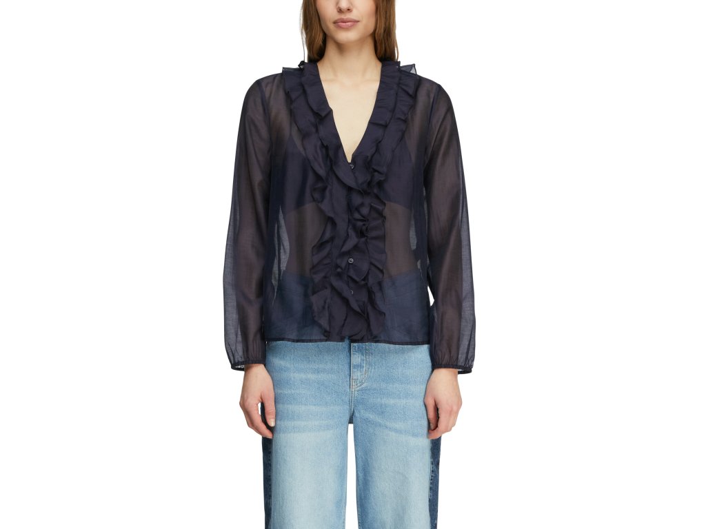 Romantická dámská halenka v tmavě modrém odstínu zaujme lehkým, průsvitným materiálem a výrazným volánovým zdobením v přední části. Hlubší výstřih do „V“ lemovaný volány dodává modelu ženský a elegantní charakter.