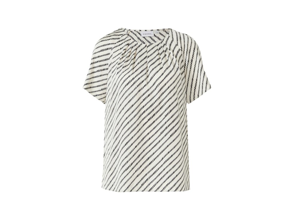 Dámská halenka s krátkým rukávem a grafickým vzorem zaujme čistým střihem a výrazným, přesto nadčasovým designem. Jemný výstřih do V s decentním řasením u krku dodává modelu ženskost, zatímco splývavý materiál zajišťuje pohodlí při nošení. Ideální volba do kanceláře i pro sofistikovaný každodenní styling.