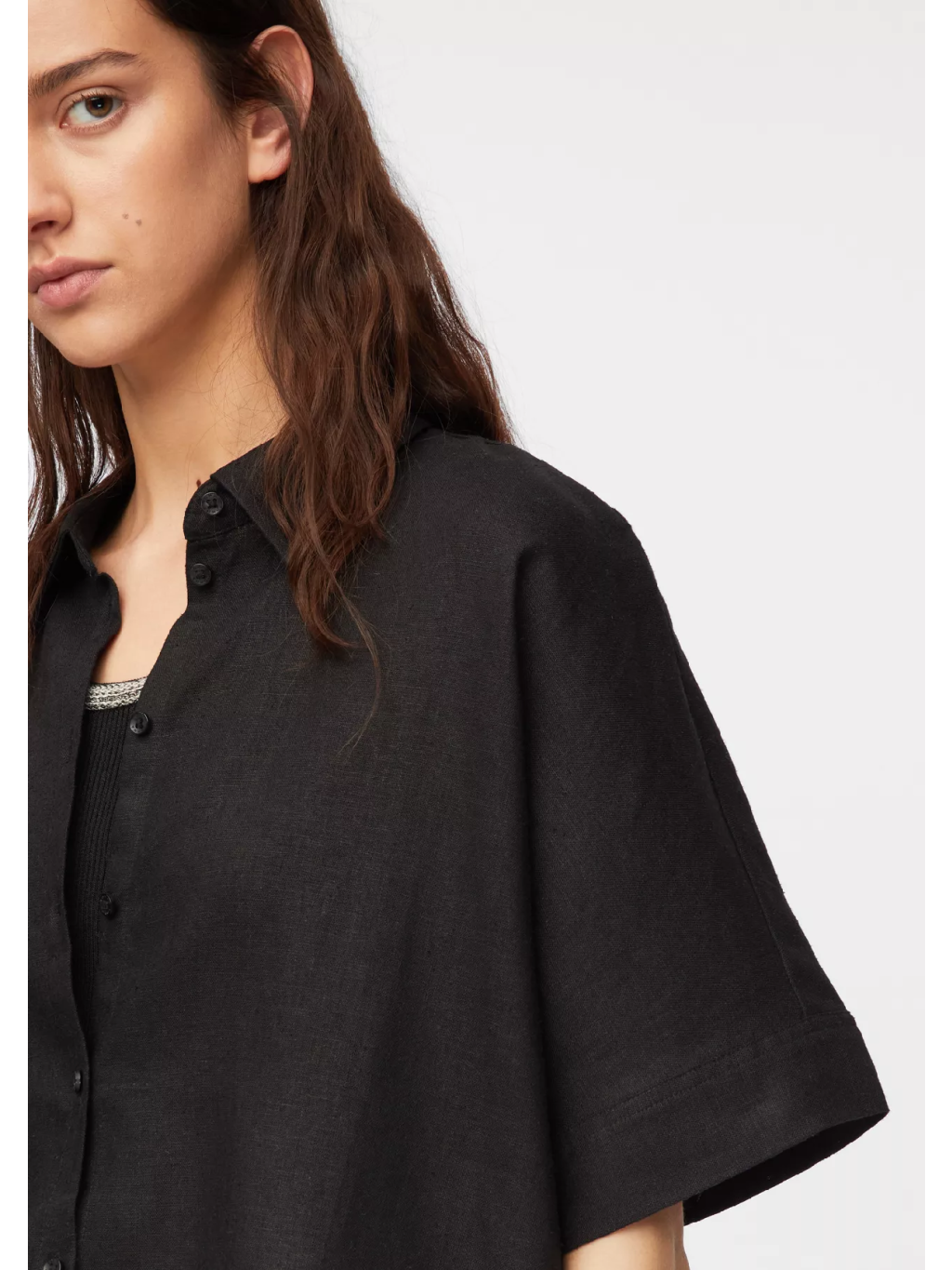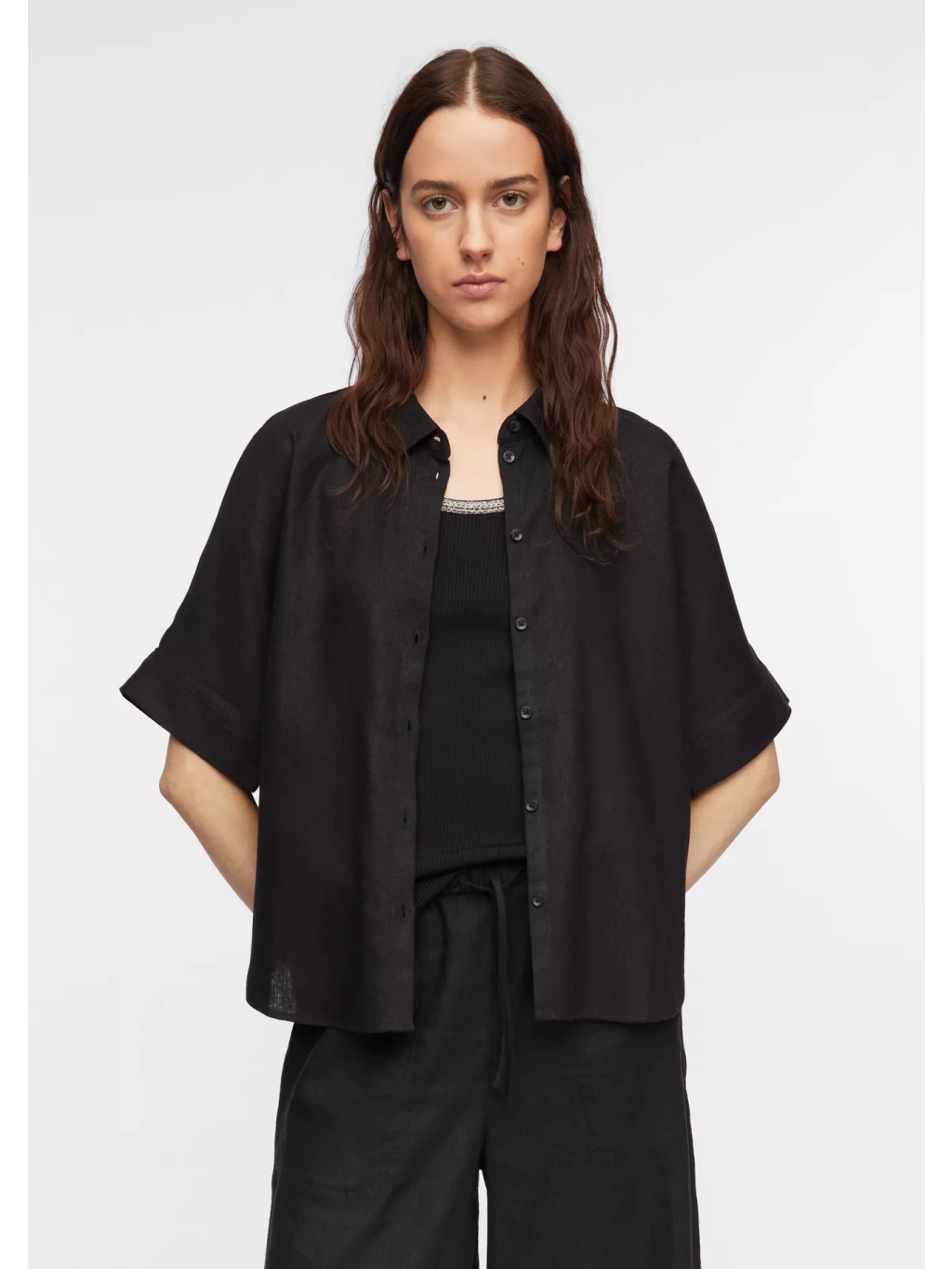 Klasický límeček a zapínání na knoflíky dodávají košili elegantní nádech, zatímco minimalistické provedení umožňuje snadné kombinování s kalhotami, sukní i šortkami. Skvěle se hodí jak pro každodenní nošení, tak i pro uvolněný pracovní outfit.