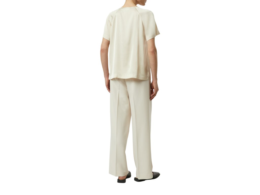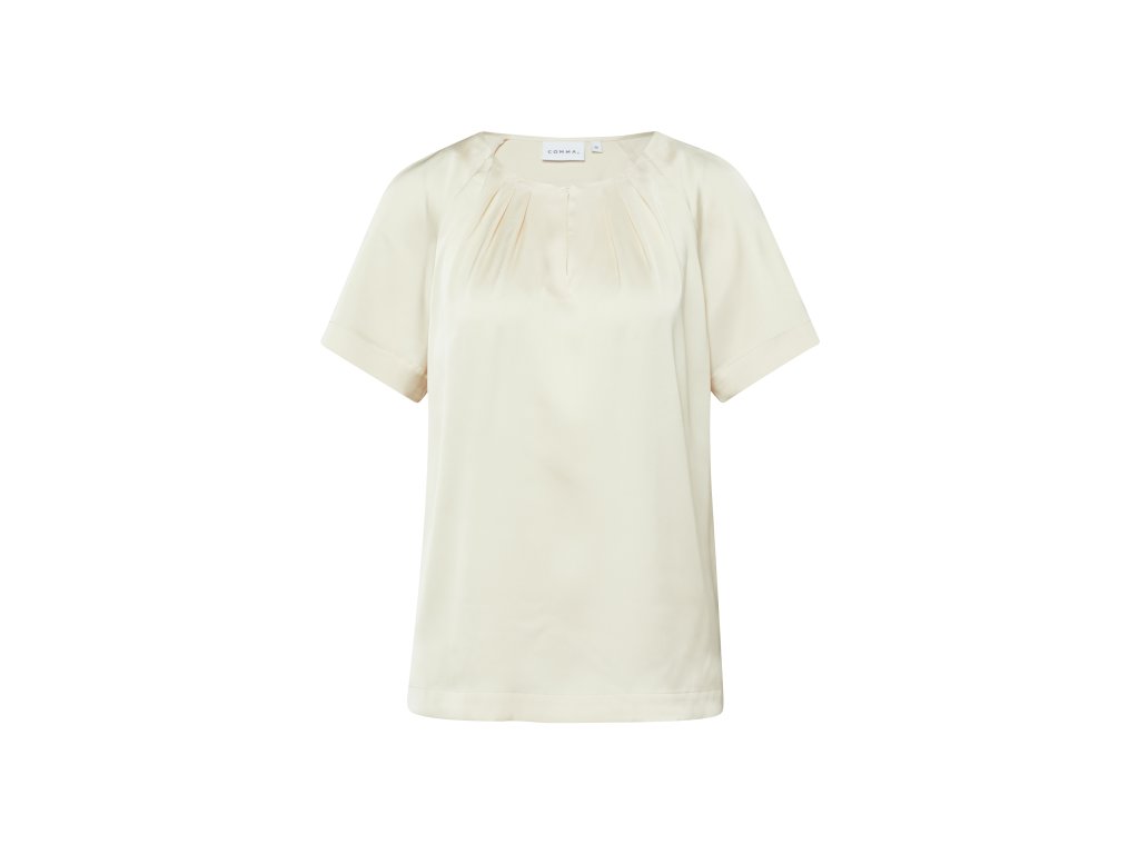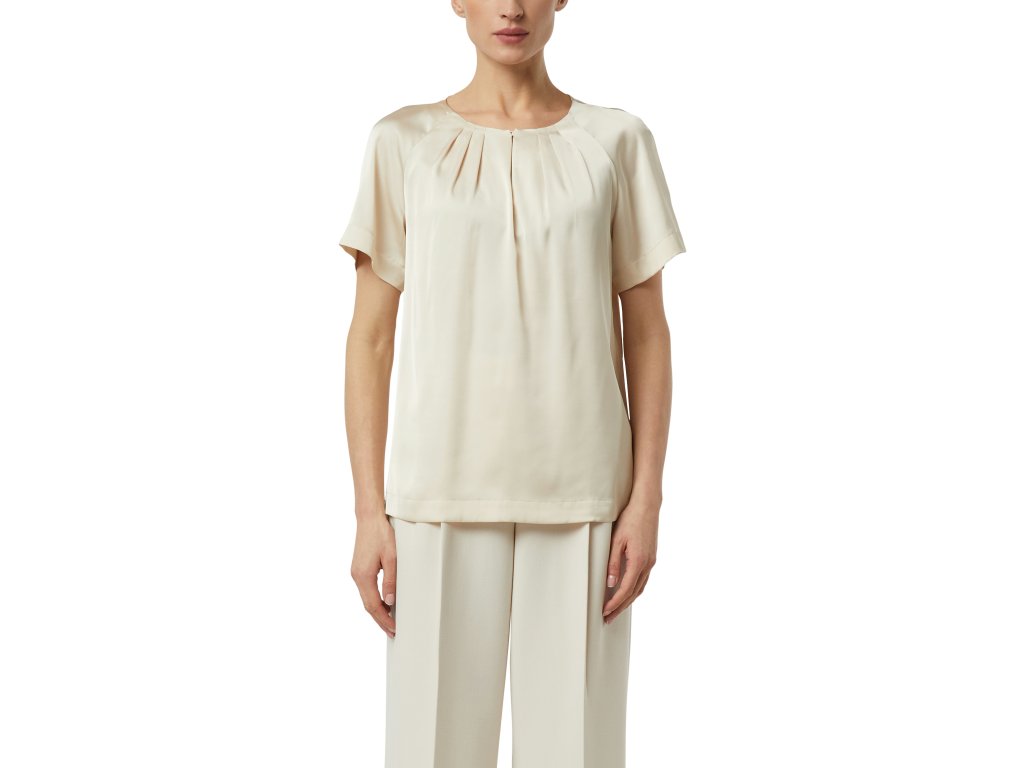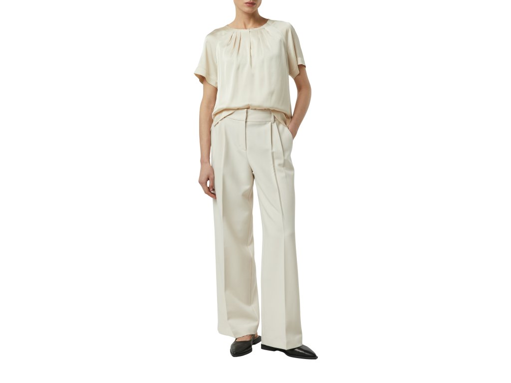 Dámská halenka s krátkým rukávem a jemným řasením u výstřihu působí lehce, čistě a velmi sofistikovaně. Splývavý materiál dodává modelu vzdušnost, zatímco decentní řasení u kulatého výstřihu vytváří elegantní detail, který jemně zvýrazňuje horní část siluety. Ideální volba do kanceláře i pro slavnostnější každodenní styling.