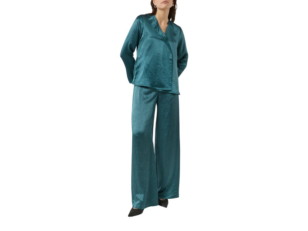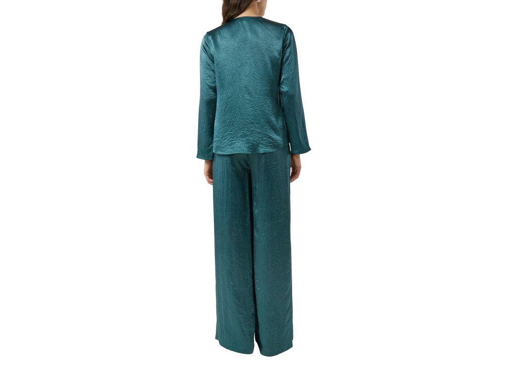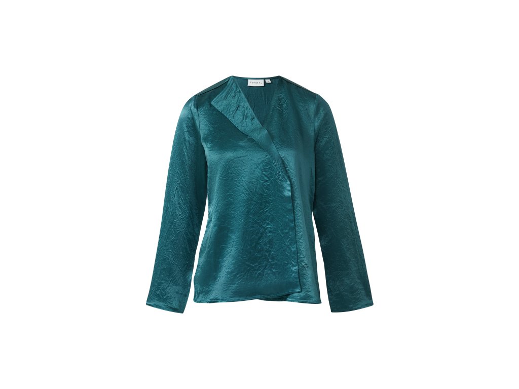 Elegantní halenka v sytém petrolejovém odstínu zaujme decentním leskem a jemně mačkanou strukturou materiálu. Přední překládaný detail vytváří ženskou siluetu a dodává modelu sofistikovaný charakter. Skvělá volba jak do kanceláře, tak pro večerní příležitosti.