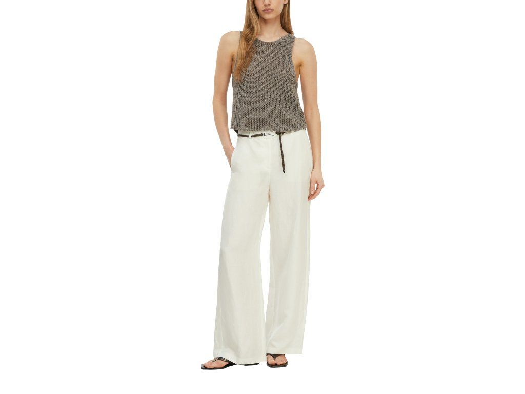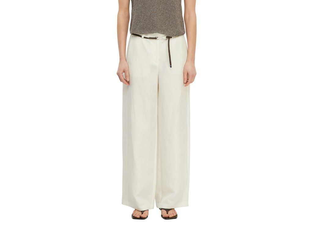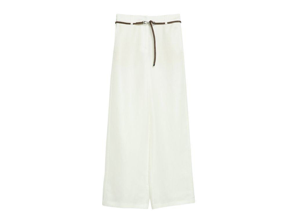 Kalhoty jsou doplněny tenkým páskem s jemným detailem, který zvýrazňuje pas a dodává celkovému vzhledu sofistikovaný akcent. Lehký, hladký materiál je příjemný na nošení a zajišťuje maximální komfort.