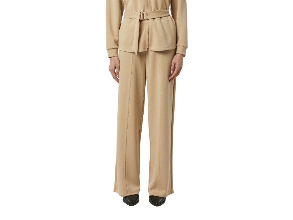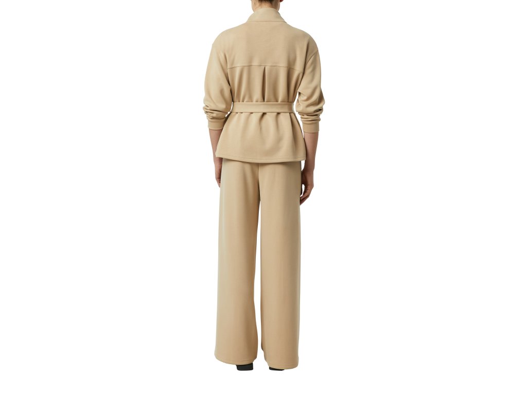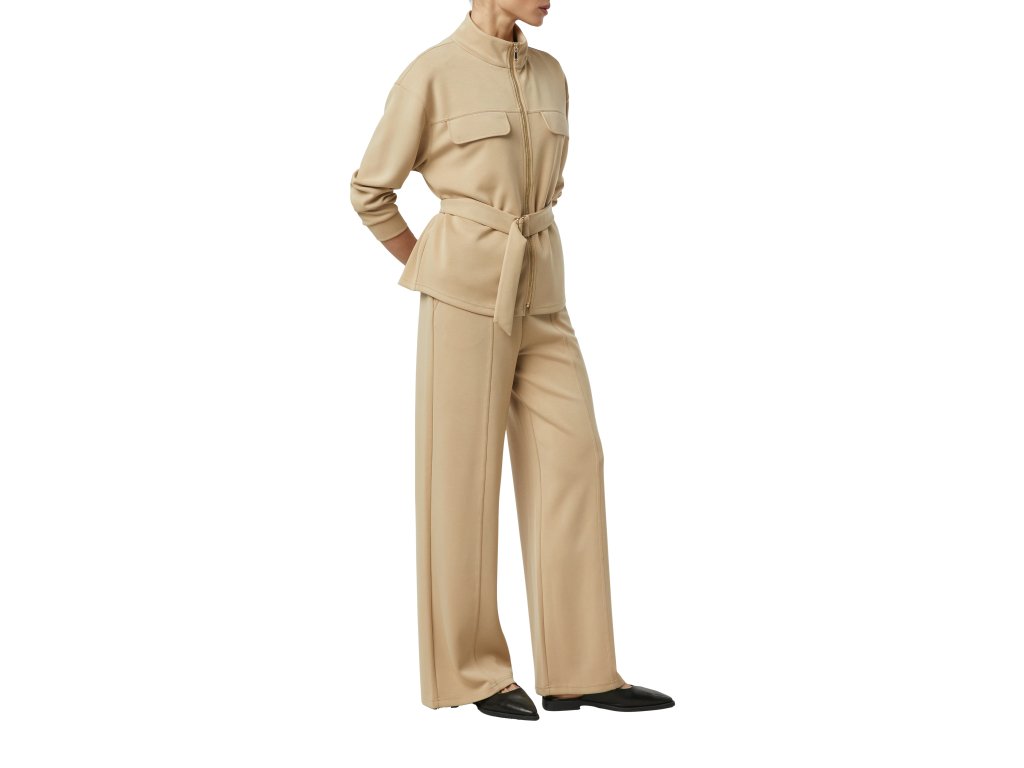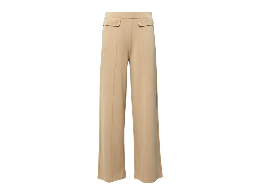 Model má rovné, široké nohavice a čisté provedení s jemnými puky, které dodávají kalhotám sofistikovaný vzhled. Neutrální béžový odstín se snadno kombinuje s halenkami, saky i pleteninou a je perfektní volbou do kapslového šatníku.