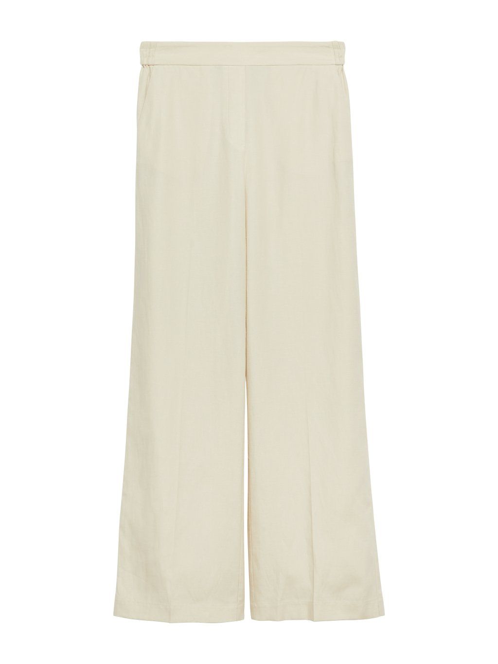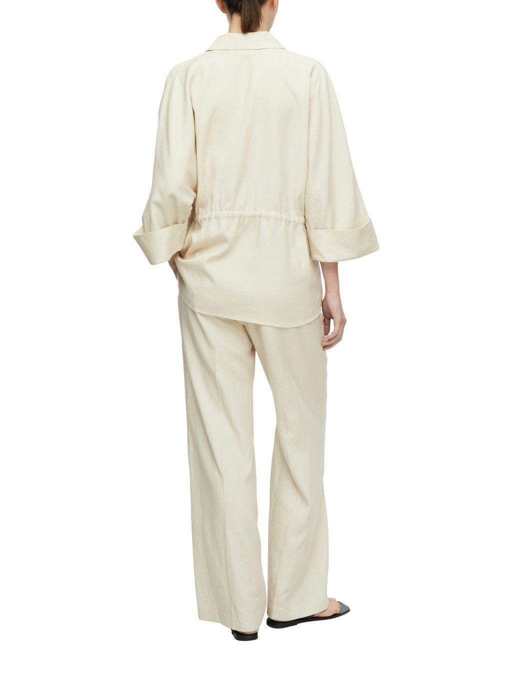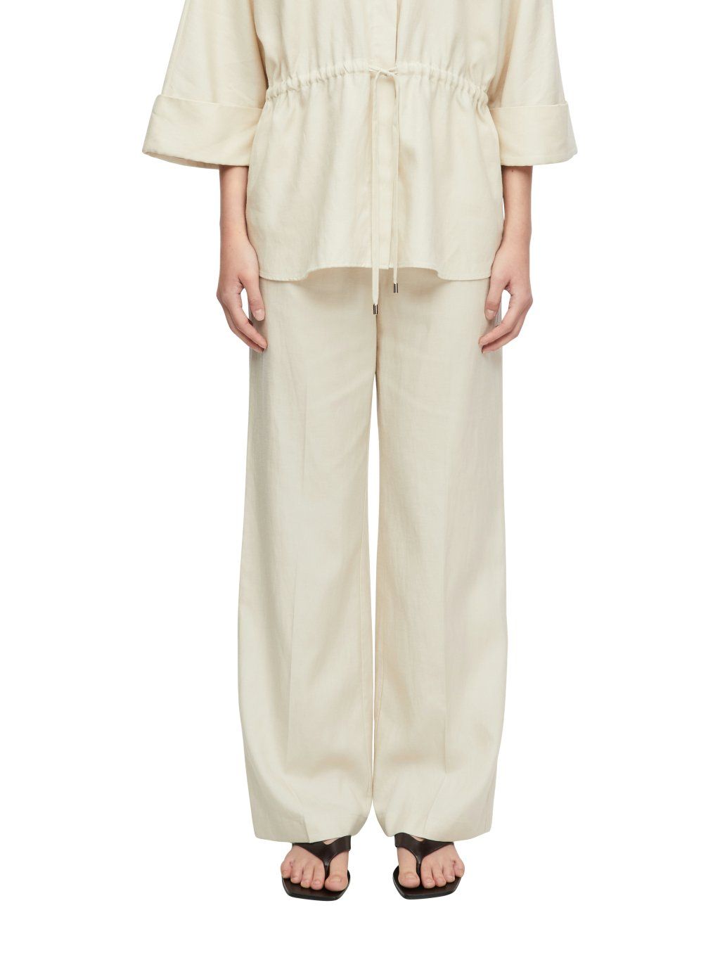 Kalhoty mají volný, rovný střih se širokými nohavicemi, který působí uvolněně a zároveň velmi elegantně. Elastický pas se šňůrkou na stažení umožňuje přizpůsobení podle potřeby a zaručuje pohodlné usazení. Minimalistický design podtrhuje jejich univerzálnost a snadnou kombinovatelnost.