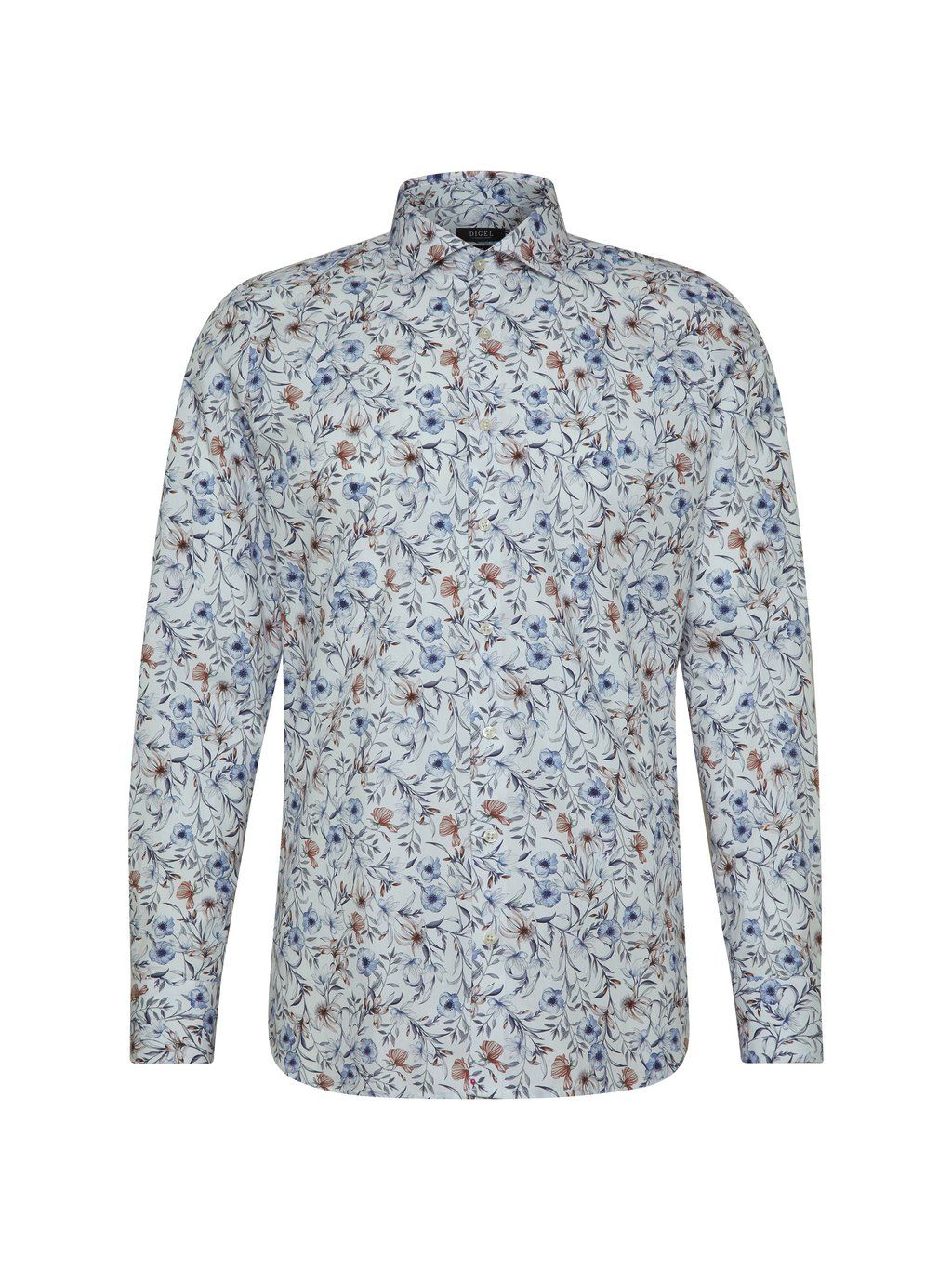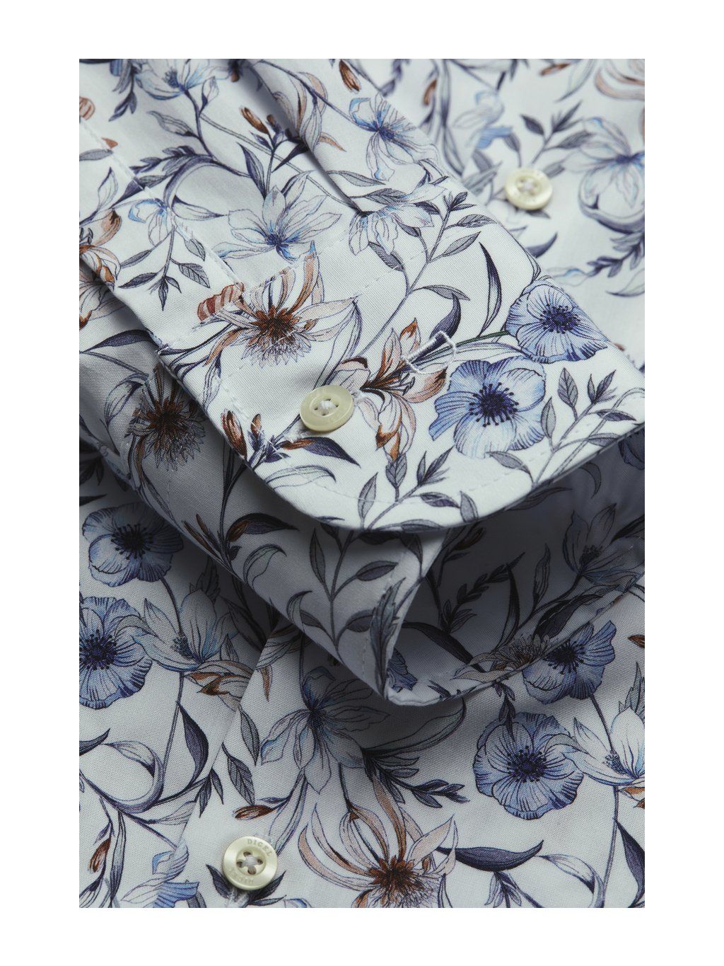 Pánská košile s jemným květinovým vzorem je ideální volbou pro muže, kteří chtějí oživit svůj outfit a zároveň si zachovat elegantní vzhled. Světlý podklad doplněný modro-hnědým květovaným motivem působí svěže a stylově, takže košile skvěle vynikne.