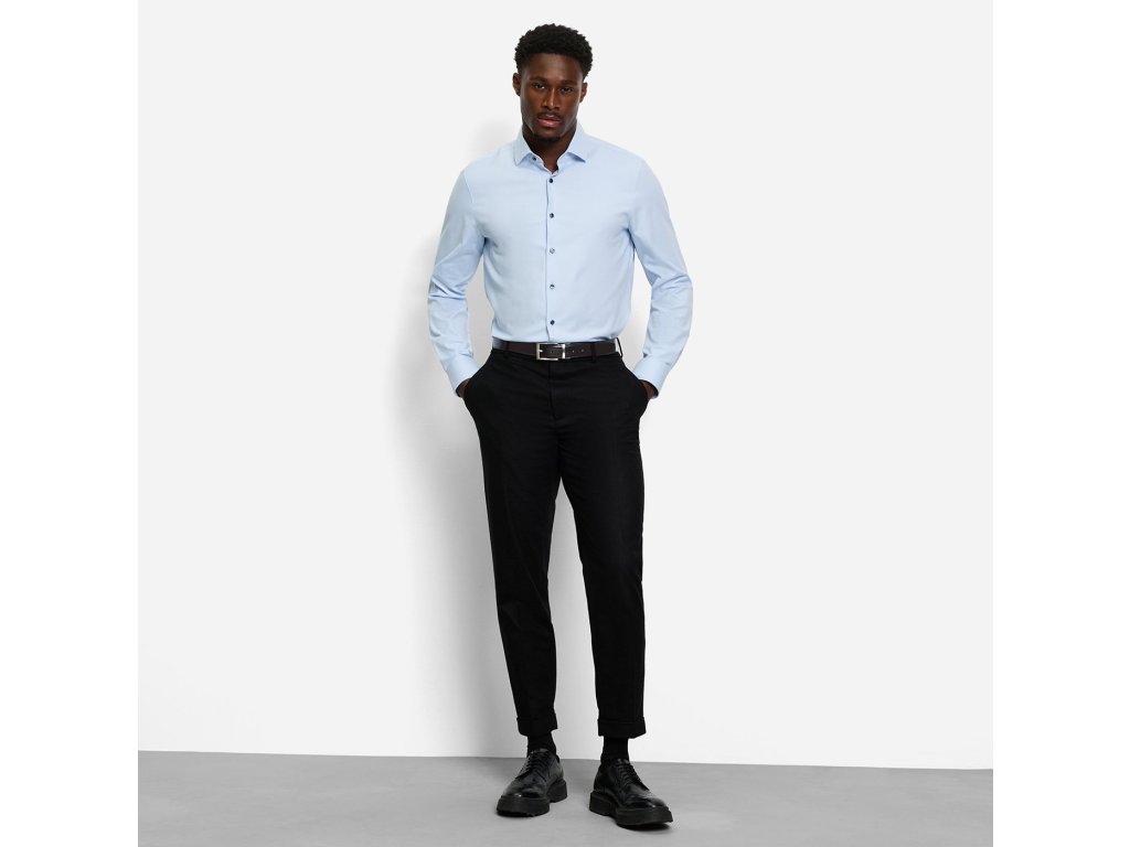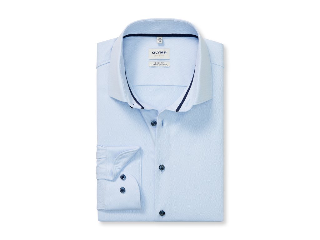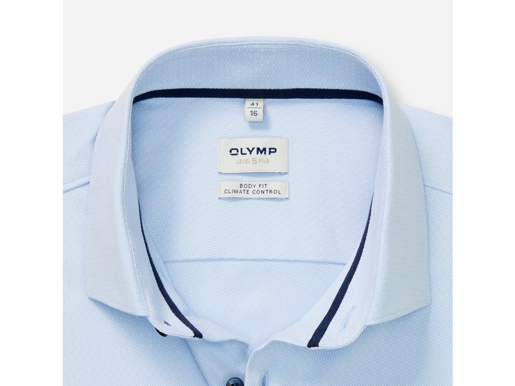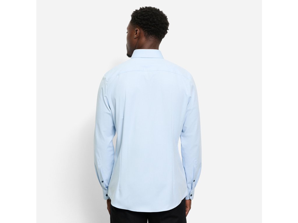 Elegantní pánská košile OLYMP v jemném modrém odstínu je skvělou volbou pro moderní business i chytrý casual styl. Má precizní střih, decentní micro-strukturu a kontrastní detaily na límci a knoflících, které dodají outfitu nenápadnou, ale výraznou eleganci.