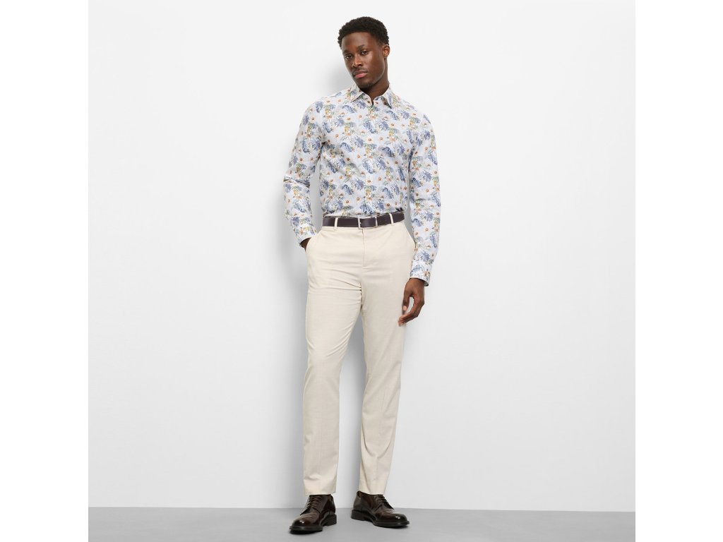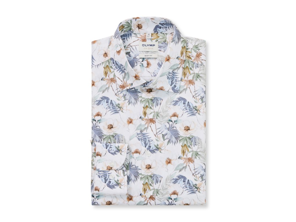 Stylová pánská košile OLYMP s výraznějším květinovým vzorem v jemných přírodních tónech přináší svěží a moderní vzhled. Kombinace světlého podkladu s detaily v modré, béžové a zelené dodává košili lehkost a originalitu, aniž by působila příliš výrazně.