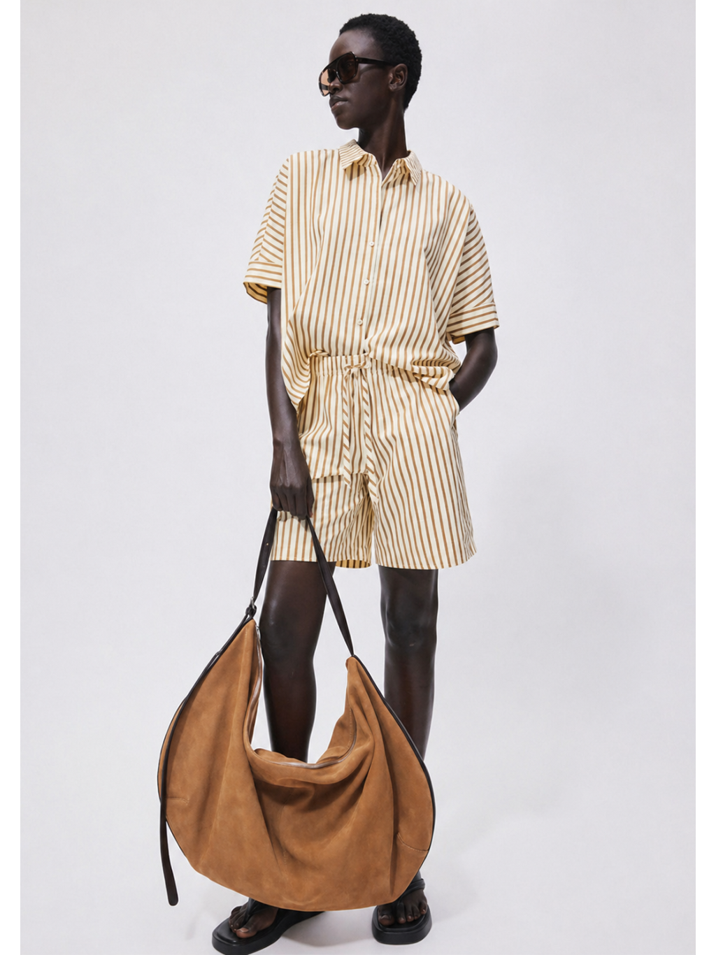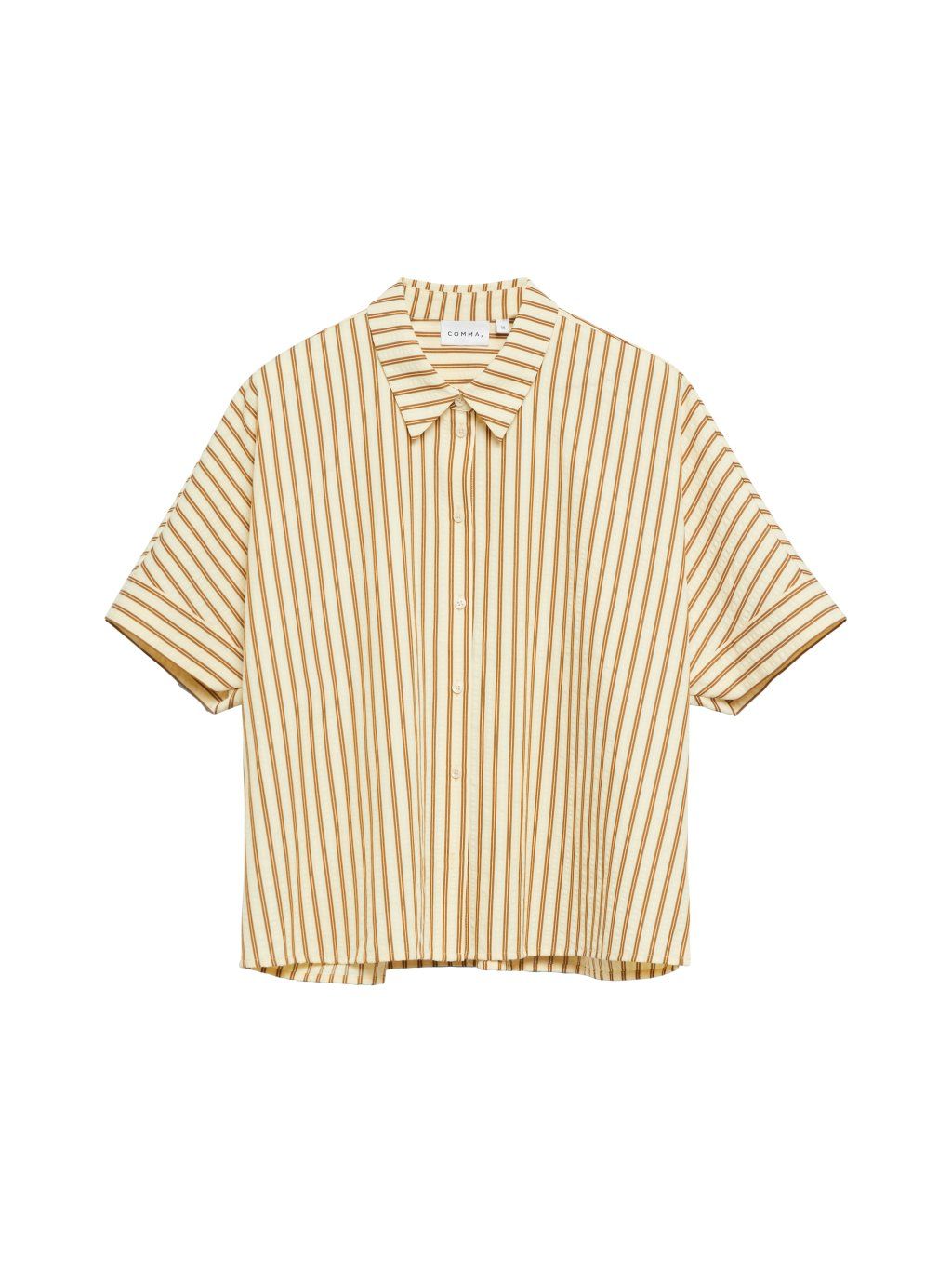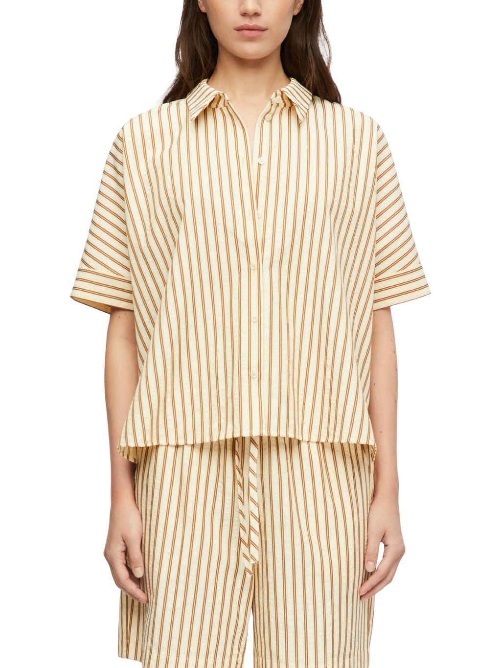 Košile má volnější střih s krátkými rukávy a klasickým límečkem, který podtrhuje její nadčasový vzhled. Přední zapínání na knoflíky působí čistě a minimalisticky, zatímco vertikální proužky opticky prodlužují siluetu.