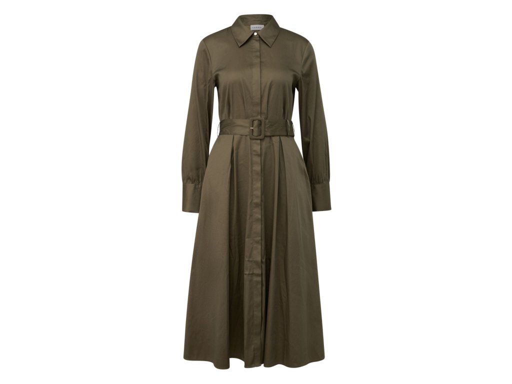 Elegantní košilové šaty v nadčasovém střihu, které spojují čisté linie s ženskou siluetou. Zapínání po celé délce a klasický límeček dodávají modelu sofistikovaný charakter, zatímco pásek v pase zvýrazňuje postavu a vytváří krásně tvarovaný vzhled. Splývavý materiál zajišťuje lehkost a komfort při nošení.