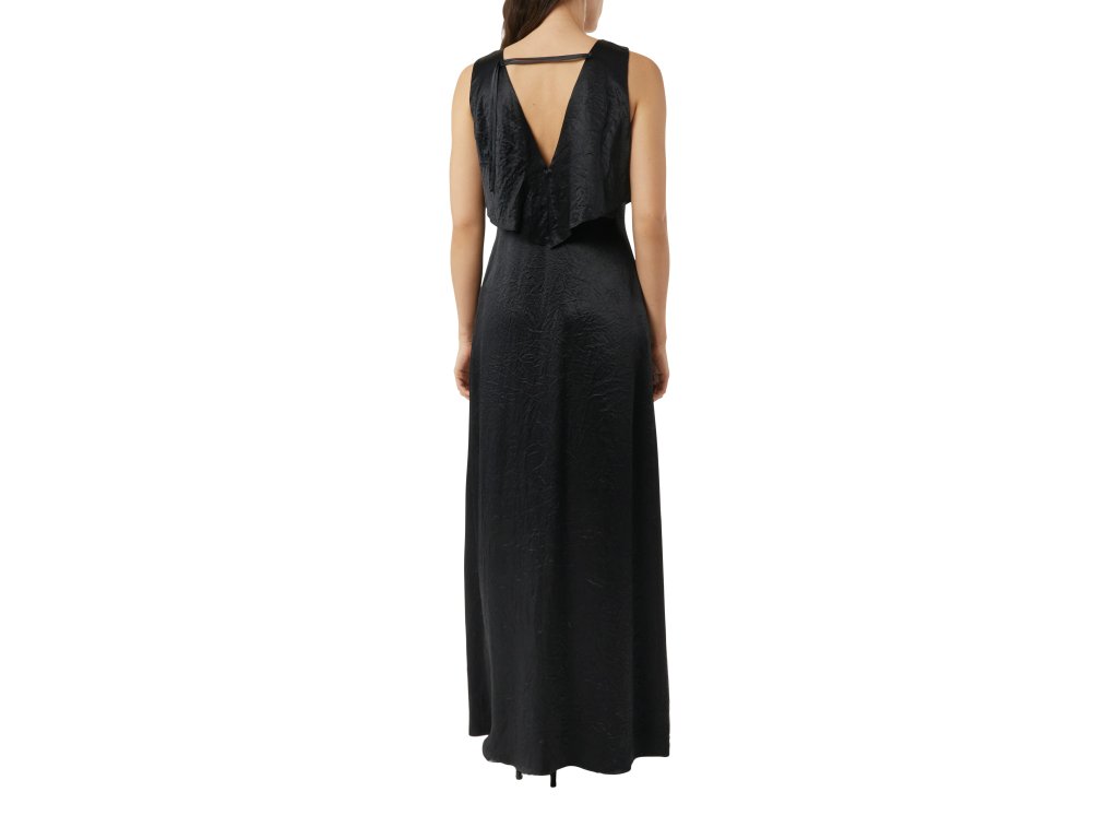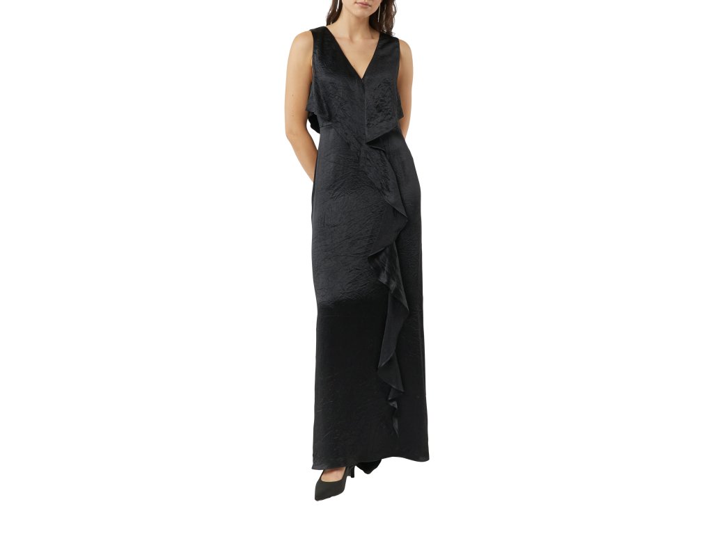 Elegantní dlouhé šaty bez rukávů v sytém petrolejovém odstínu zaujmou jemným leskem a ženským střihem. Vpředu je zdobí dekorativní volán, který dodává modelu lehkost a pohyb. Ideální volba pro slavnostní příležitosti, večírky či společenské události.