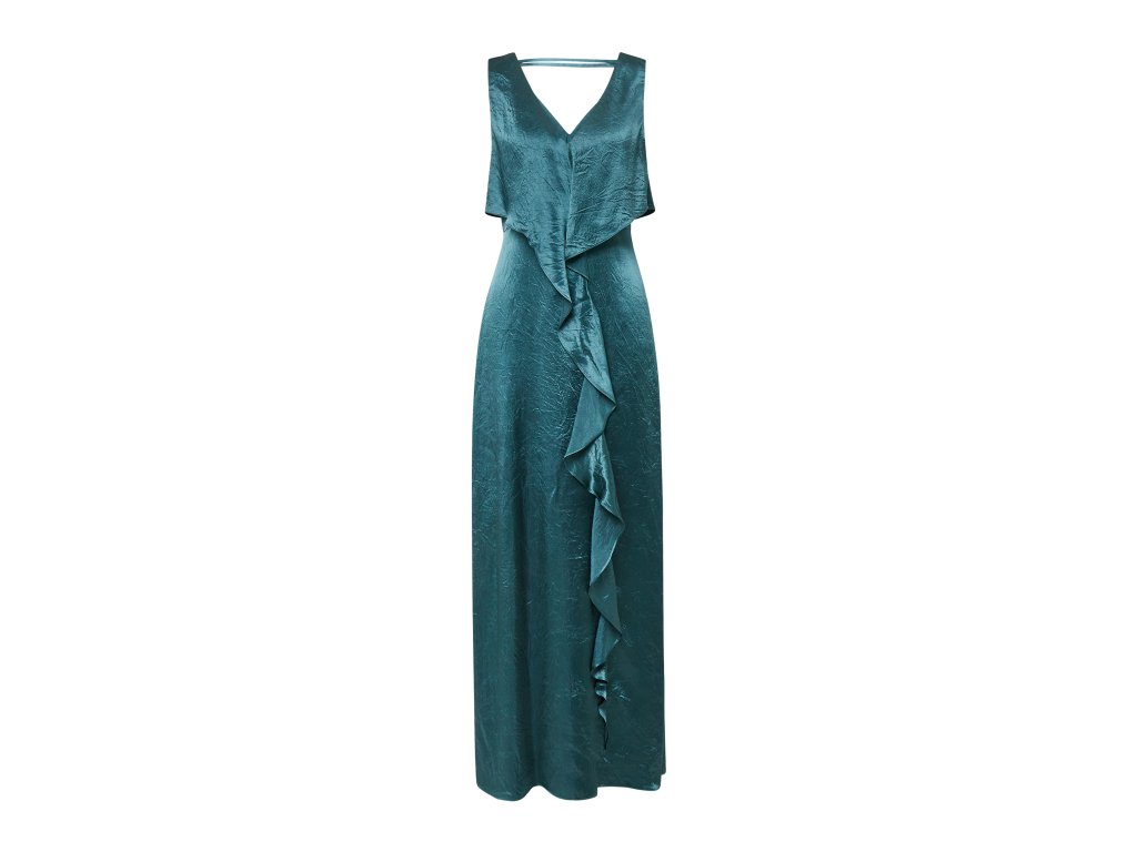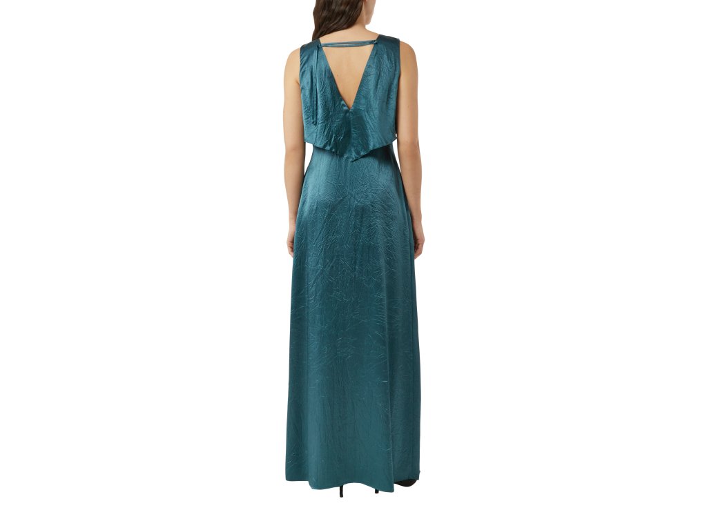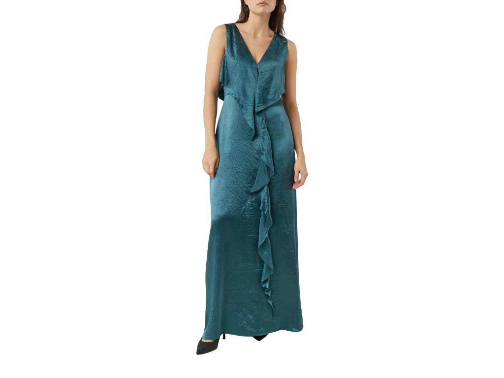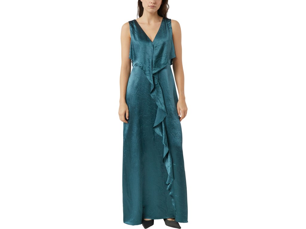 Elegantní dlouhé šaty bez rukávů v sytém petrolejovém odstínu zaujmou jemným leskem a ženským střihem. Vpředu je zdobí dekorativní volán, který dodává modelu lehkost a pohyb. Ideální volba pro slavnostní příležitosti, večírky či společenské události.