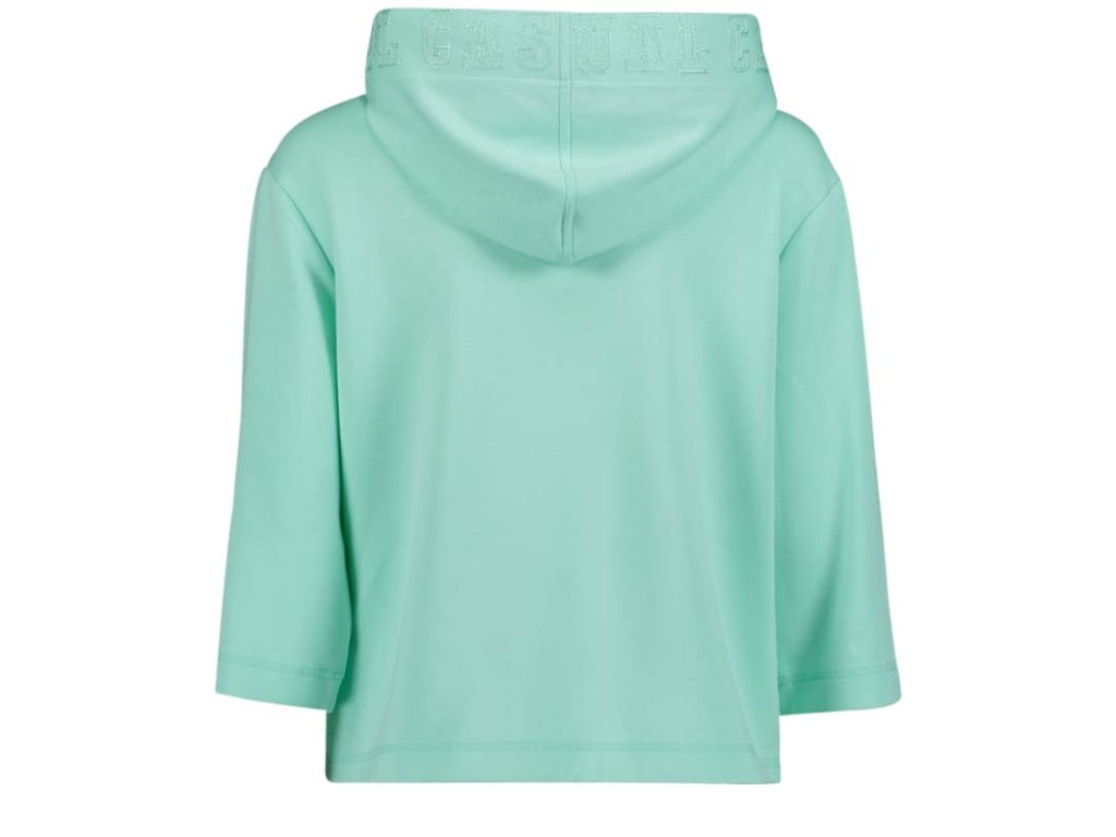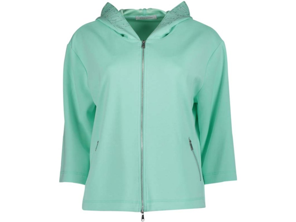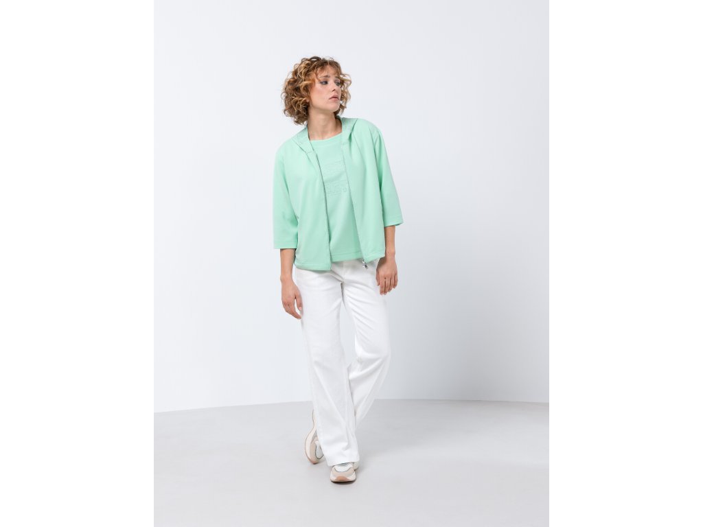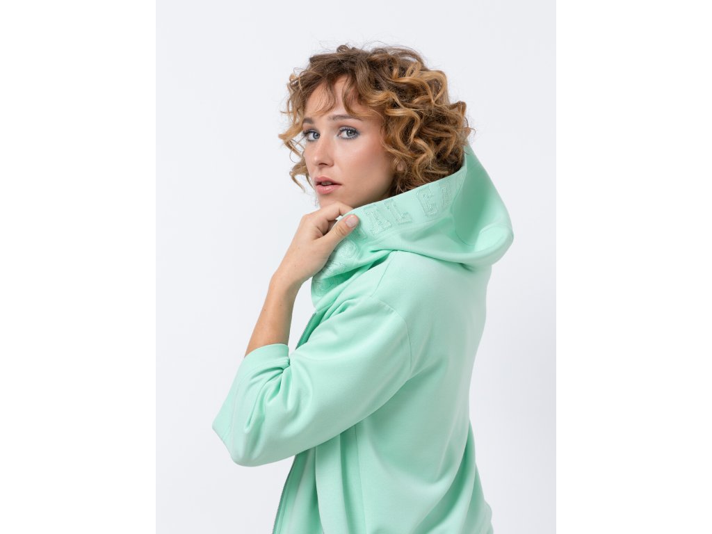 Svěží barva, pohodlný střih a moderní detaily – ideální kombinace pro váš každodenní outfit. Tato mentolová mikina na zip zaujme čistým designem a jemným zdobením na kapuci, které dodává modelu originální nádech.