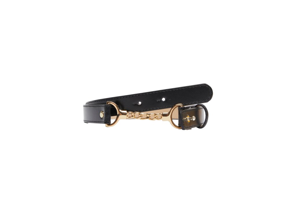 Elegantní dámský pásek v černé barvě doplněný o zlaté kovové detaily a stylovou řetízkovou sponu. Vyroben z kvalitní kůže, která zajišťuje odolnost i komfort při nošení. Ideální jako doplněk k šatům, kalhotám i sakům – dodá vašemu outfitu sofistikovaný a moderní nádech.