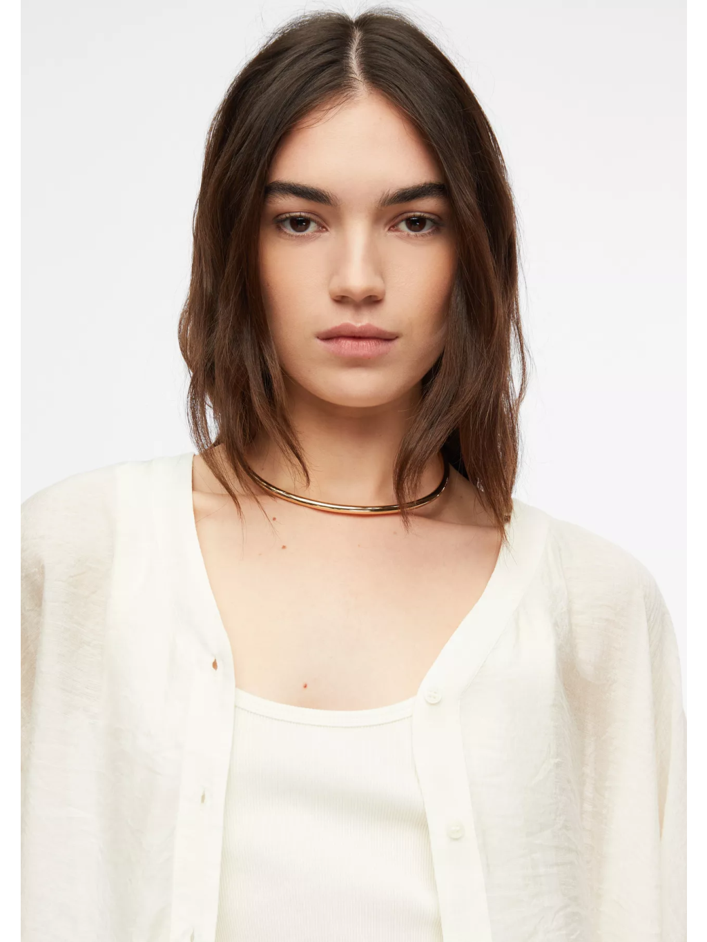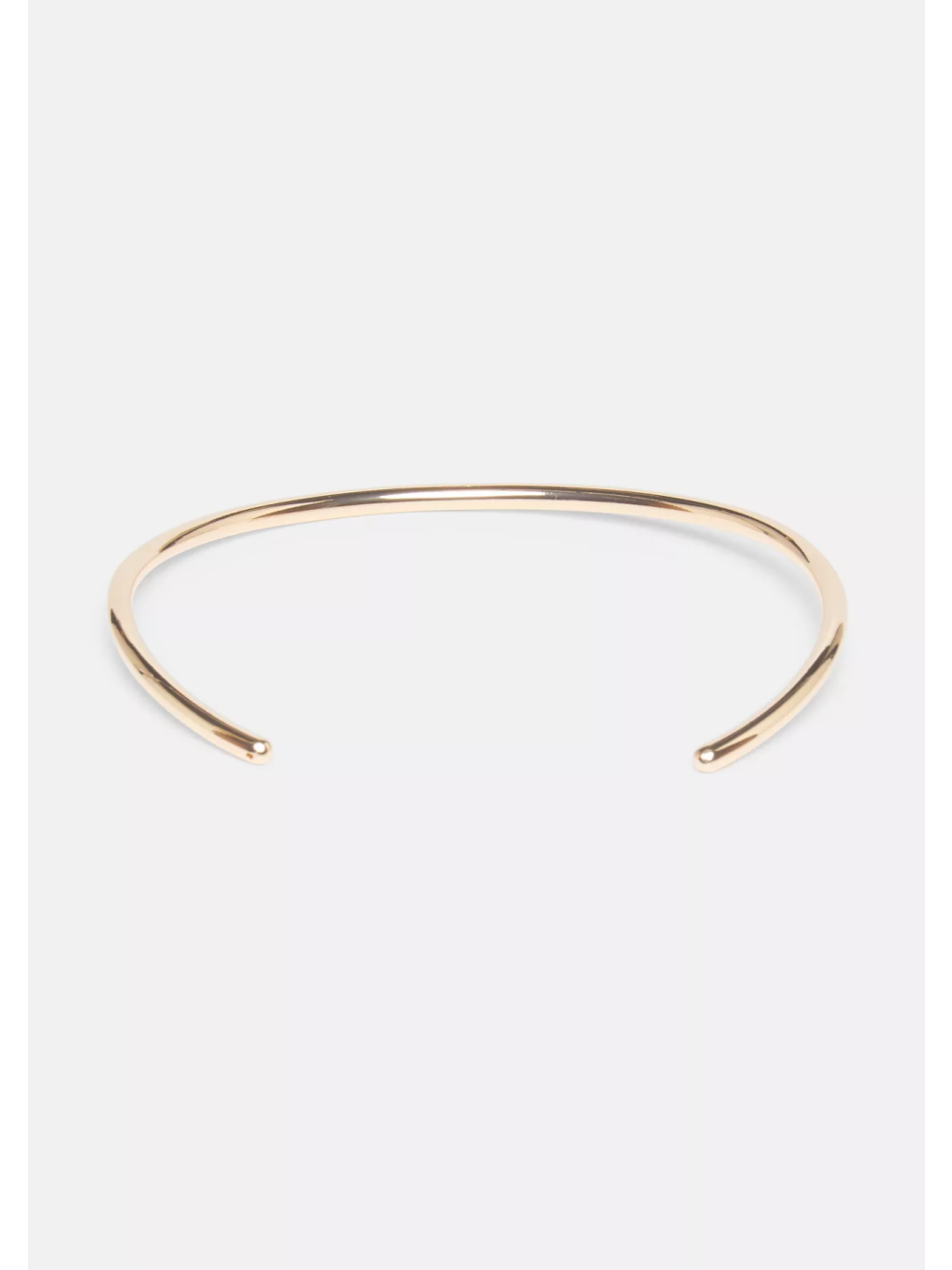 Elegantní pevný náhrdelník typu choker v minimalistickém zlatém provedení je nadčasovým doplňkem pro každou příležitost. Díky otevřené konstrukci bez zapínání se snadno nasazuje a pohodlně sedí na krku.