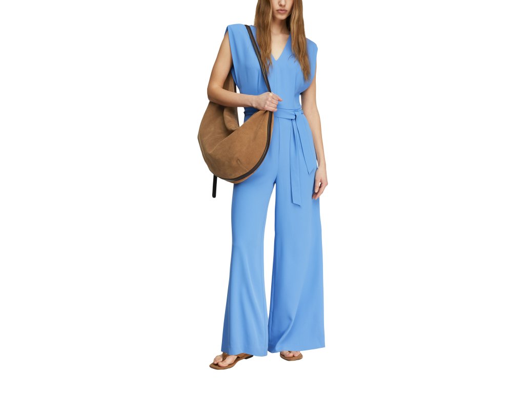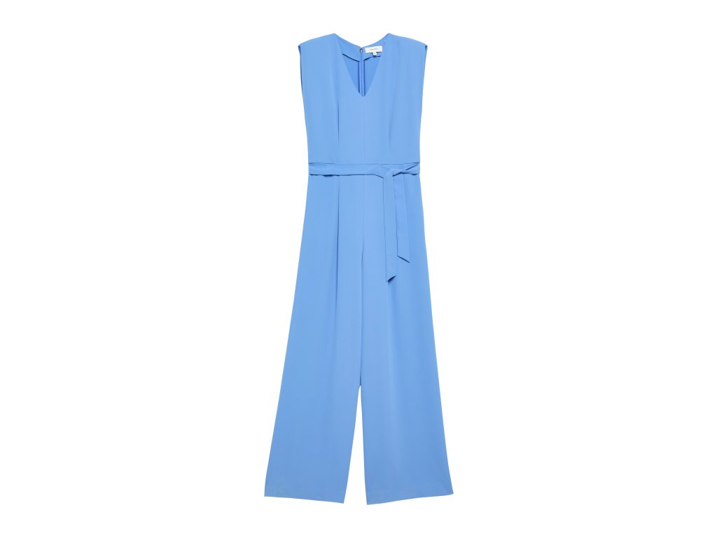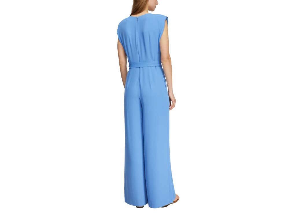Elegantní dámský overal v jemném modrém odstínu je ideální volbou pro slavnostní příležitosti i stylové letní dny. Nadčasový střih s hlubším výstřihem do „V“ krásně zvýrazní siluetu a dodá modelu ženský a sofistikovaný vzhled.