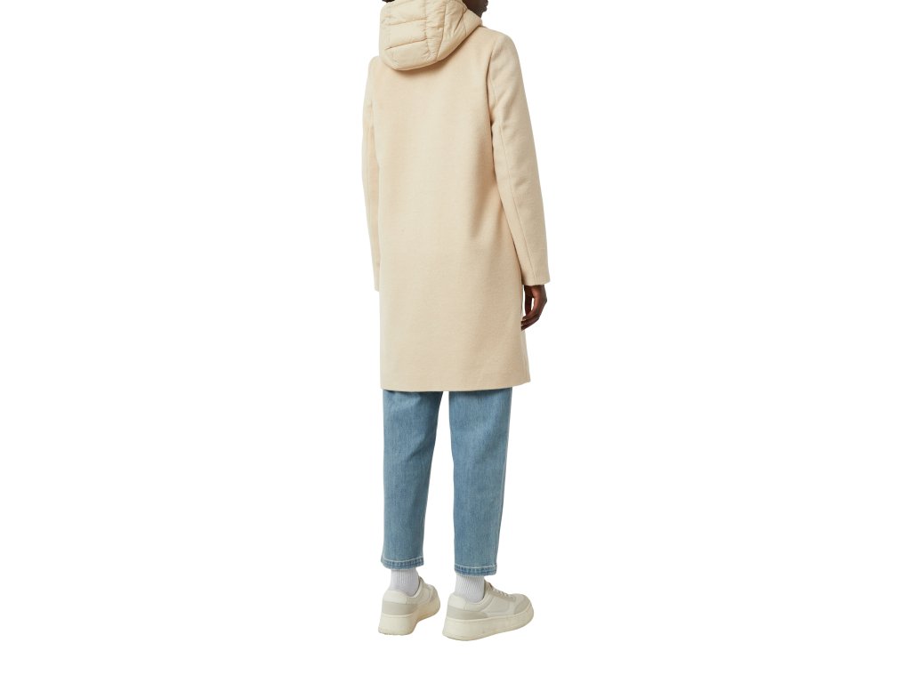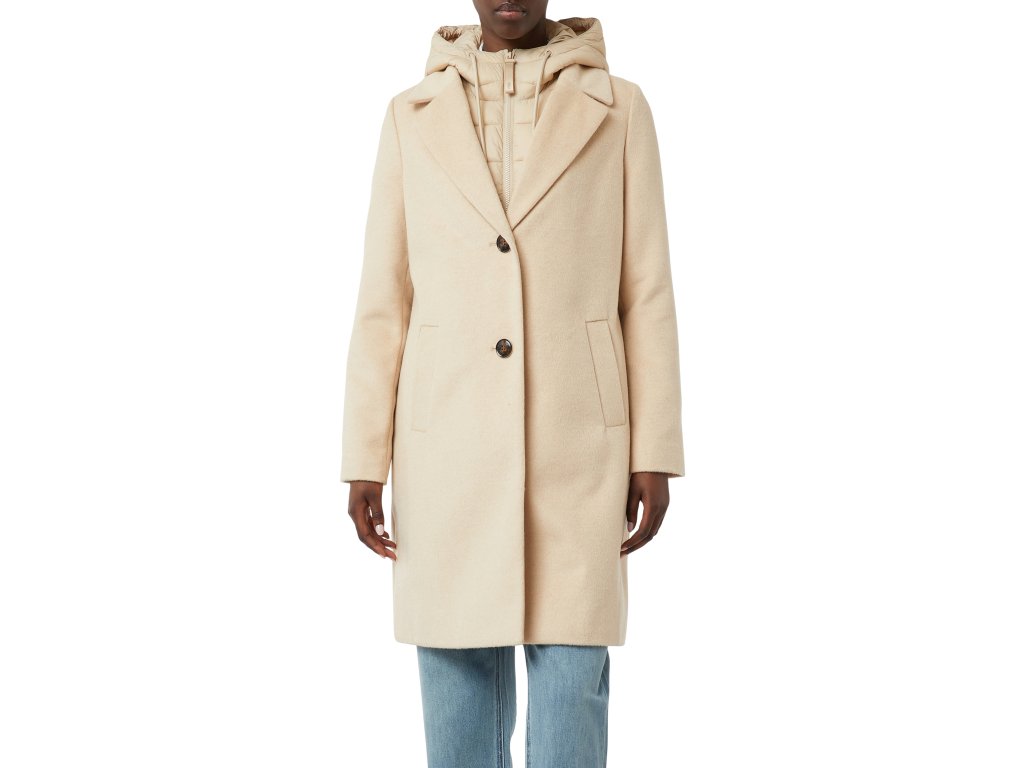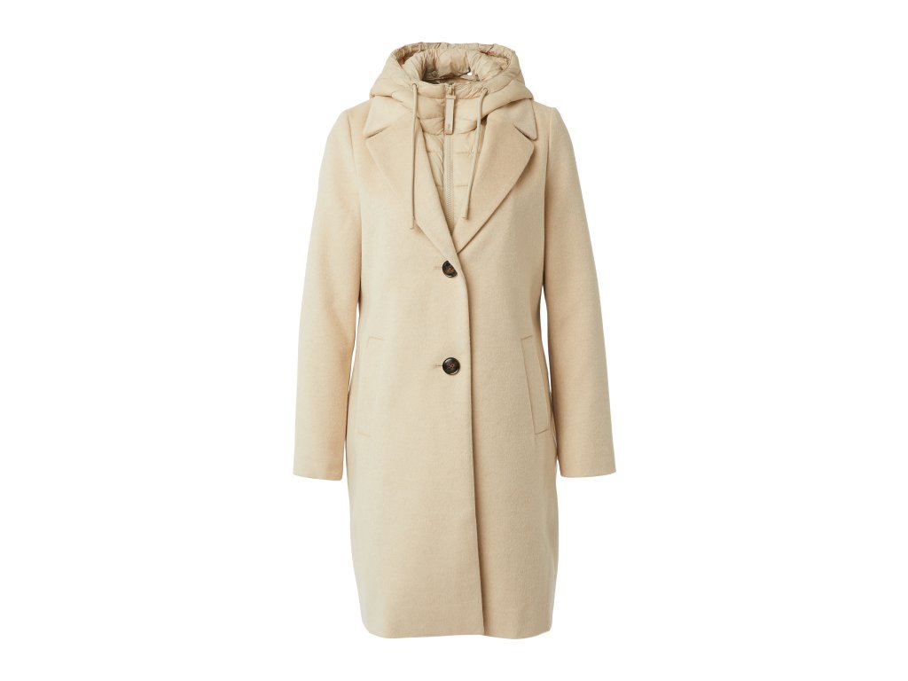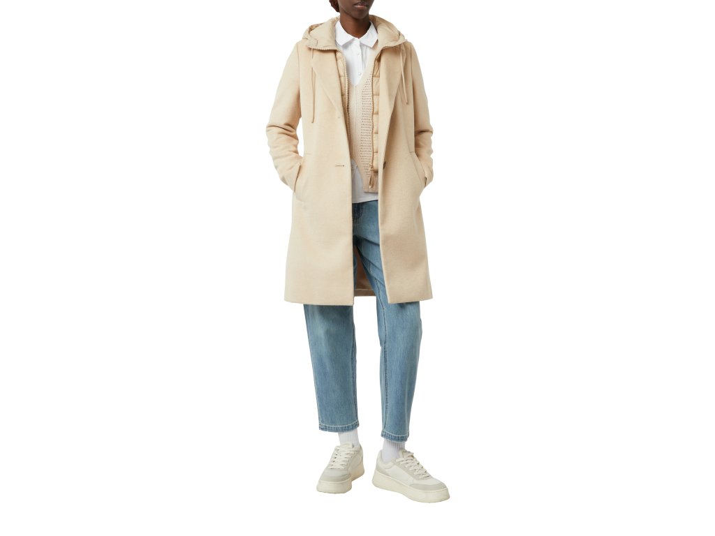 Elegantní béžový kabát s praktickou odepínací kapucí kombinuje moderní vzhled a funkčnost. Díky směsi polyesteru a vlny je hřejivý, příjemný na nošení a zároveň odolný. Zapínání na dva knoflíky a klasický límec dodávají kabátu nadčasový styl, který snadno sladíte jak s elegantním, tak s ležérním outfitem.