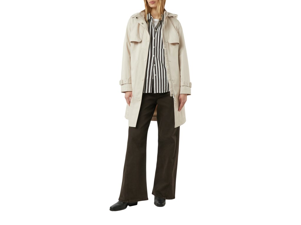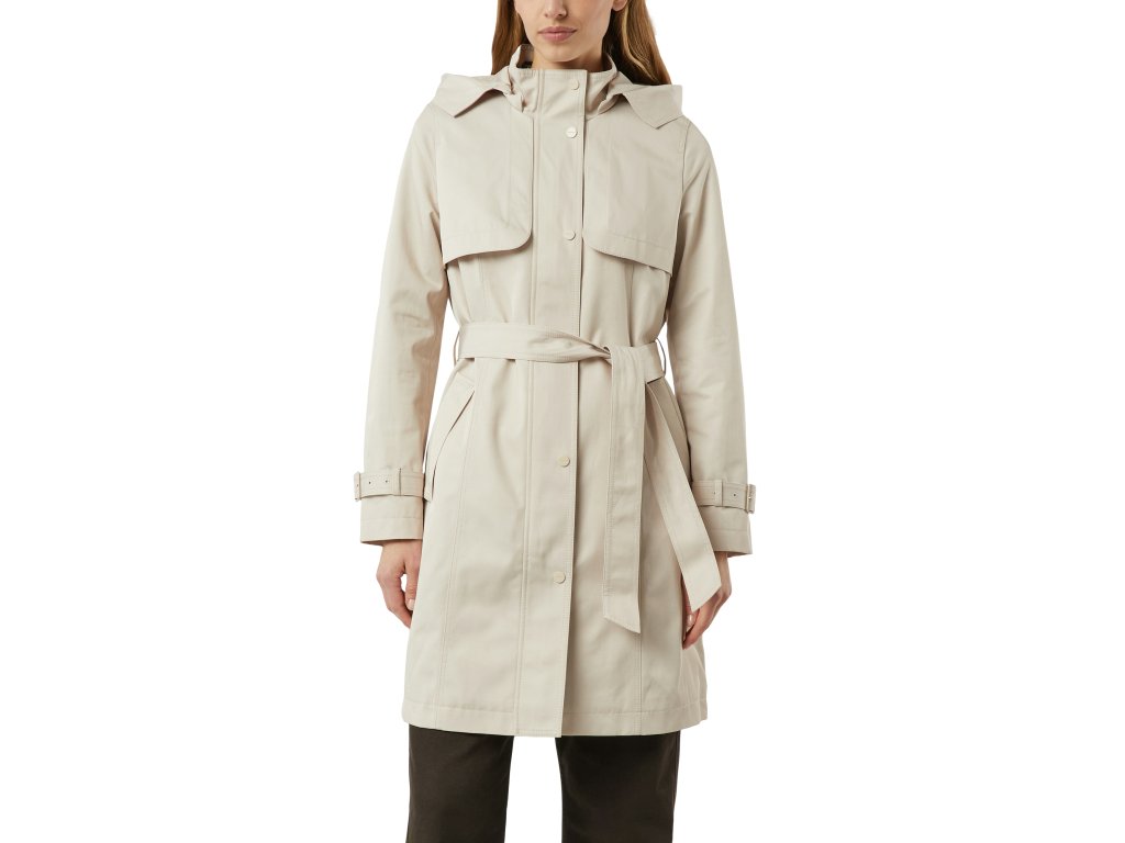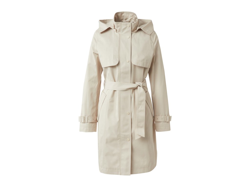 Dámský světlý kabát s kapucí a páskem je ideálním kouskem pro přechodné období. Čistý, funkční design doplňuje zvýšený límec s kapucí, praktické klopy a pasový pásek, který umožňuje upravit siluetu podle potřeby. Lehký materiál a promyšlený střih zajišťují pohodlí při každodenním nošení, zatímco neutrální barevnost nabízí snadnou kombinovatelnost.