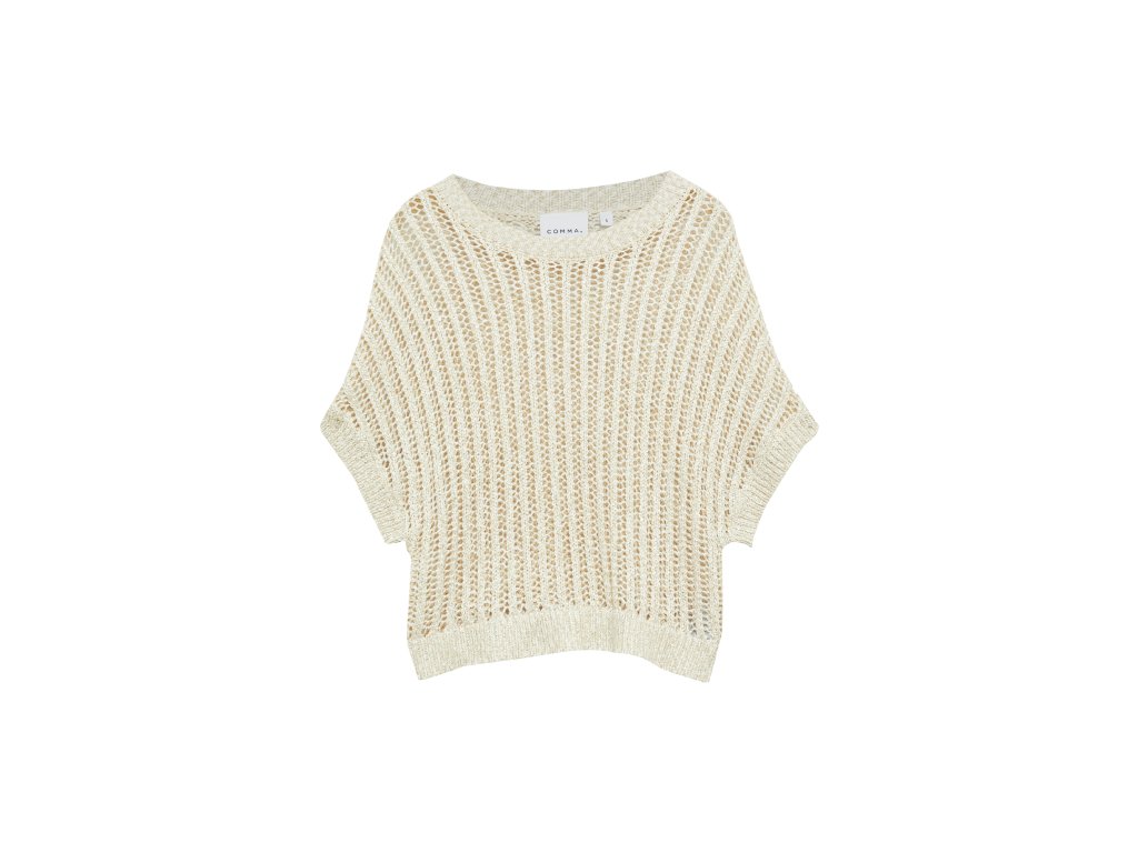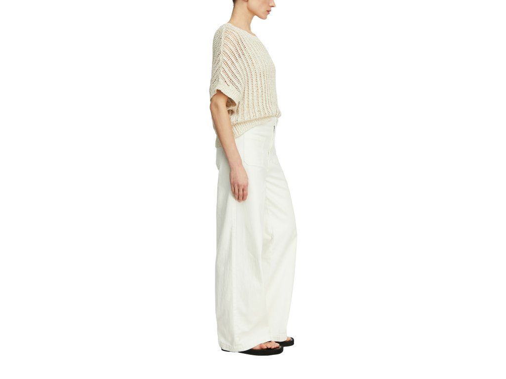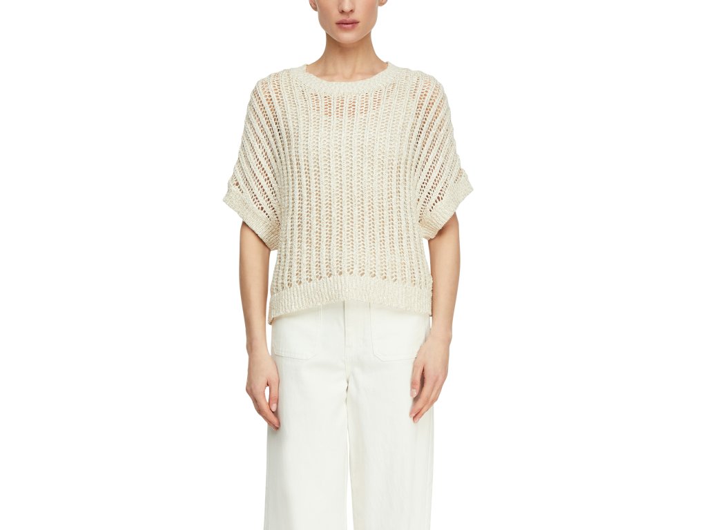Lehký dámský svetr v jemném krémovém odstínu zaujme svým vzdušným pleteným vzorem, který dodává outfitu zajímavou texturu a moderní vzhled. Volnější střih a krátké rukávy zajišťují pohodlí při nošení a dělají ze svetru ideální kousek pro vrstvení. Skvěle se kombinuje s kalhotami, sukní i džínami.