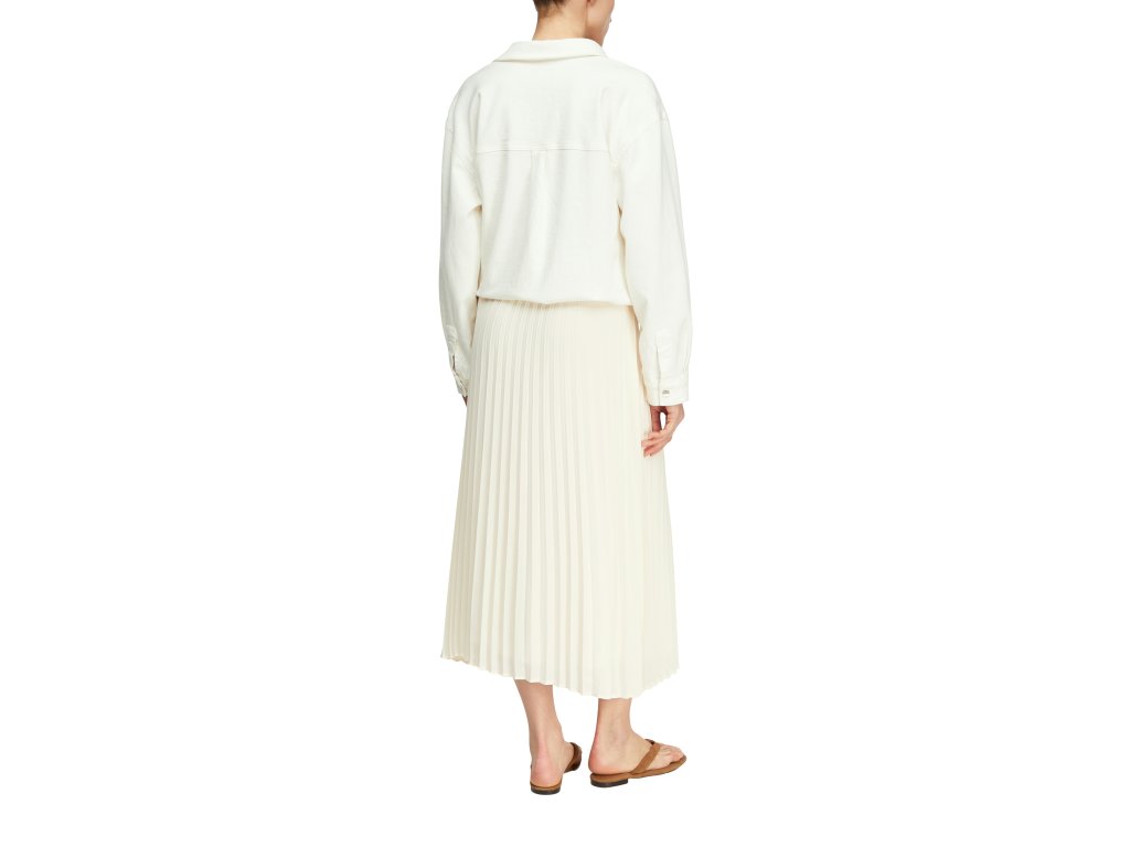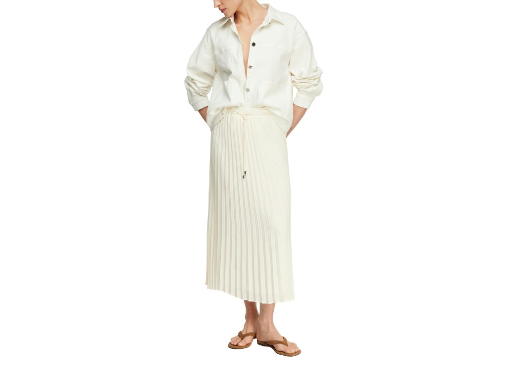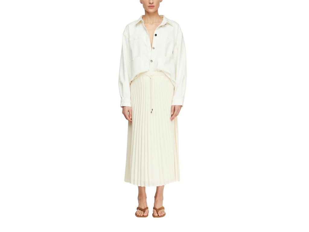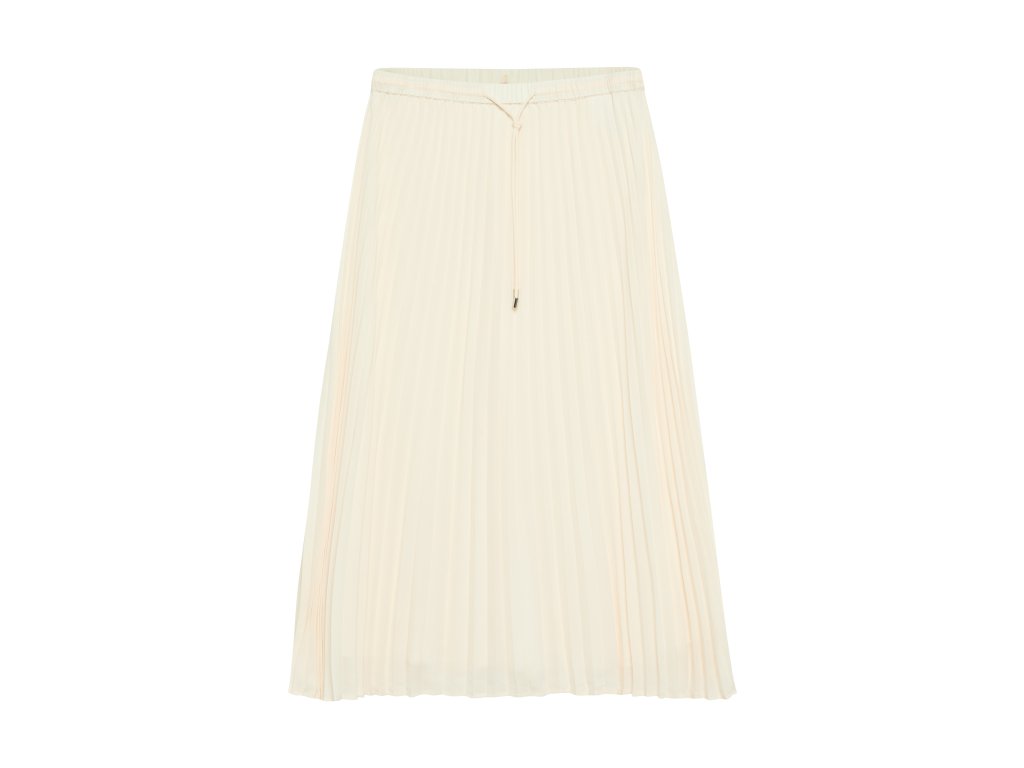 Elegantní plisovaná sukně v jemném krémovém odstínu je nadčasovým kouskem, který dodá outfitu lehkost a ženskost. Midi délka působí sofistikovaně a zároveň velmi univerzálně – ideální do práce i na volný čas.