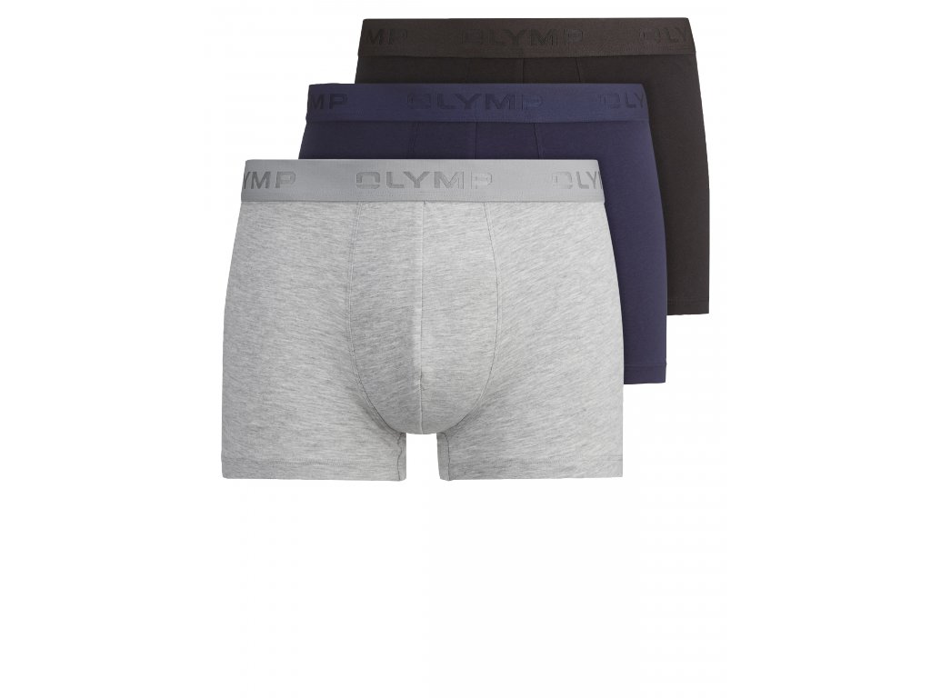 Tříbalení boxerek OLYMP nabízí pohodlí a skvělý vzhled. Díky zkrácené nohavičce a elastickému značkovému pasu mají tyto vysoce kvalitní přiléhavé retro boxerky vynikající vlastnosti pro nošení a údržbu Stylové elastické trenýrky z měkké bavlny jsou k dispozici ve třech nadčasových barvách: černé, modré a šedé.
