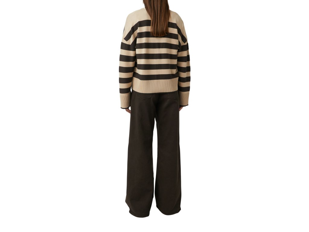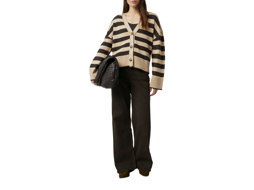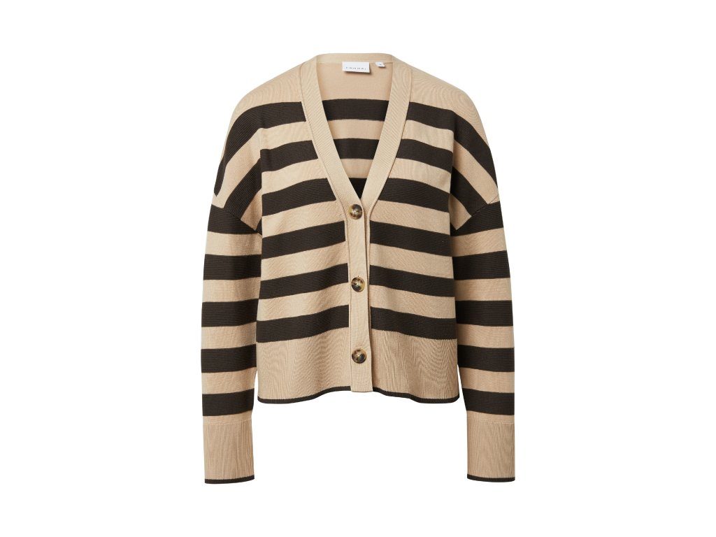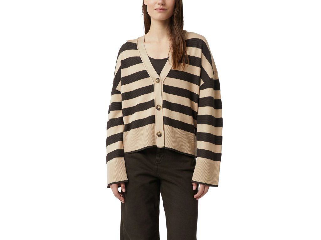 Dámský cardigan s výrazným pruhovaným vzorem, který dodá outfitu moderní a zároveň nadčasový vzhled. Příjemný pletený materiál zajišťuje pohodlí při nošení, zatímco zapínání na knoflíky umožňuje variabilní styling. Skvěle se hodí k džínům, kalhotám i šatům a využijete ho jak na běžné nošení, tak do práce.
