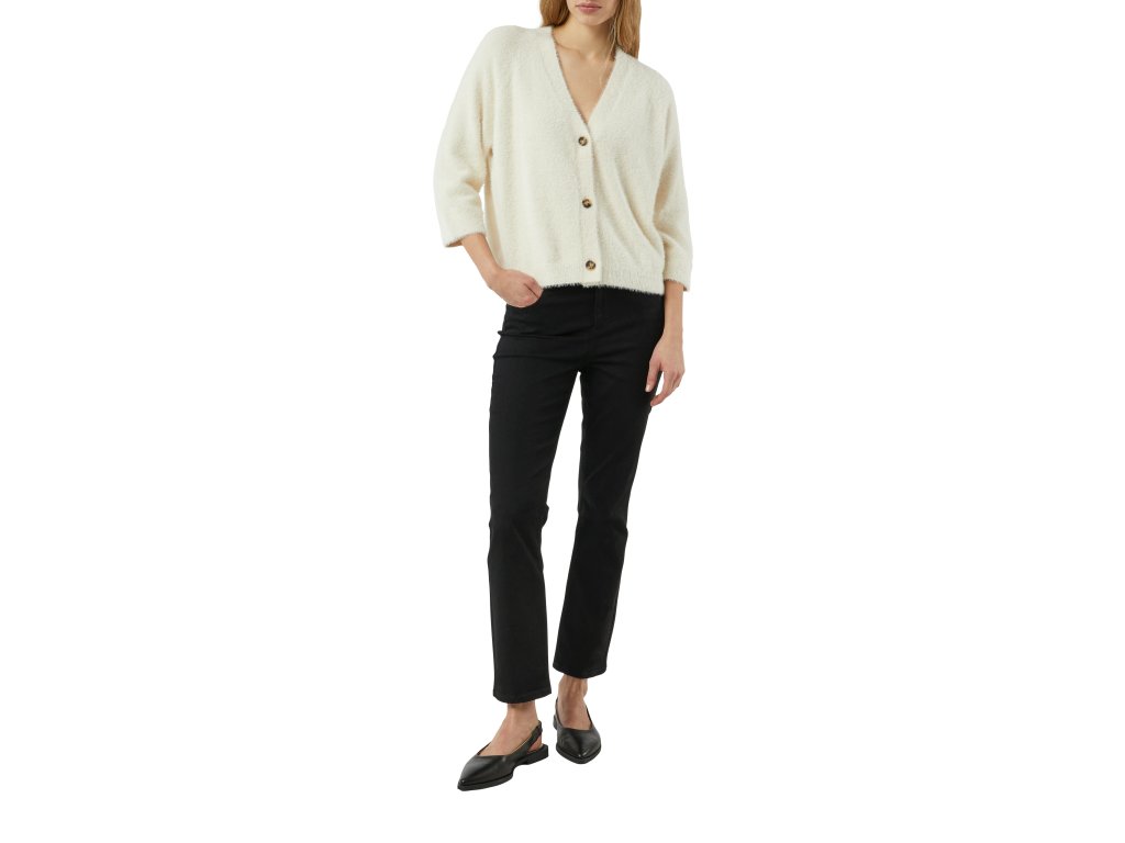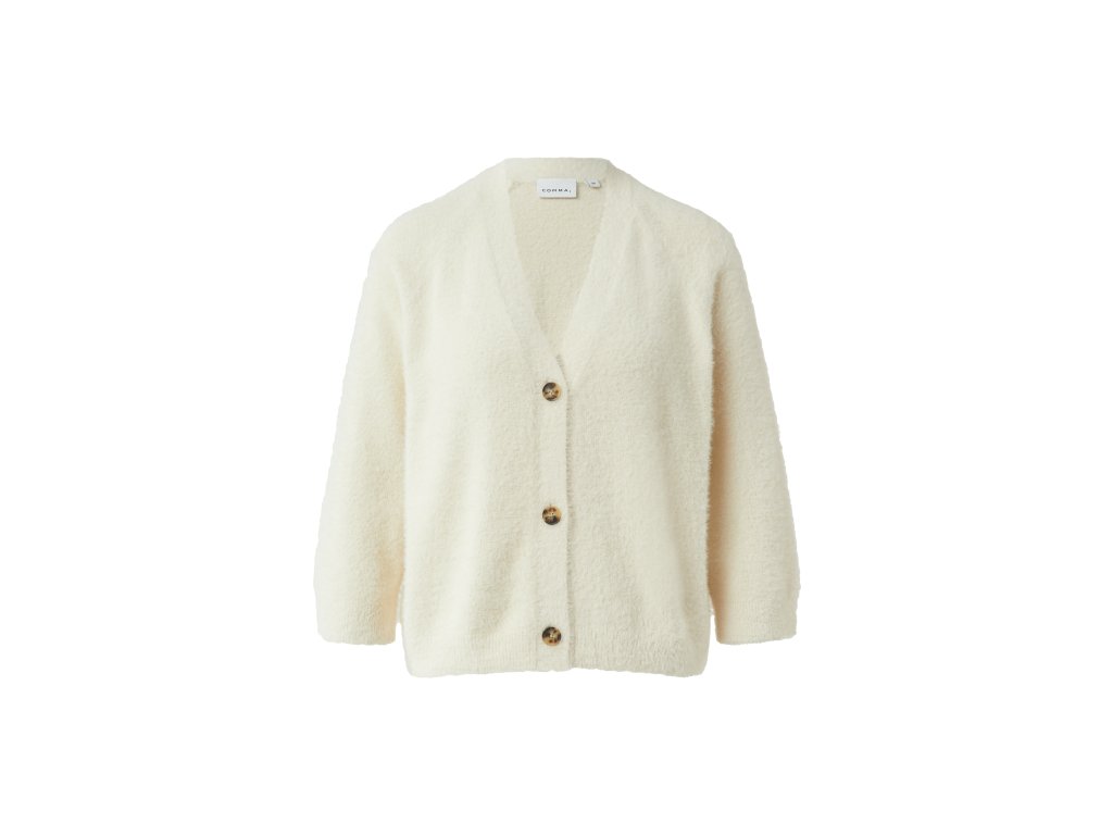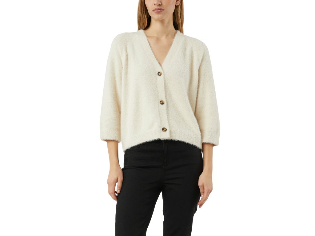 Měkký kardigan s výstřihem do V je ideální volbou pro pohodlné, ale elegantní vrstvení. Nadýchaný materiál dodává modelu hřejivý a útulný charakter, zatímco volnější střih zajišťuje maximální komfort při nošení. Výstřih do V a zapínání na knoflíky vytváří čistou, nadčasovou siluetu, která se snadno kombinuje s topy, šaty i košilemi.