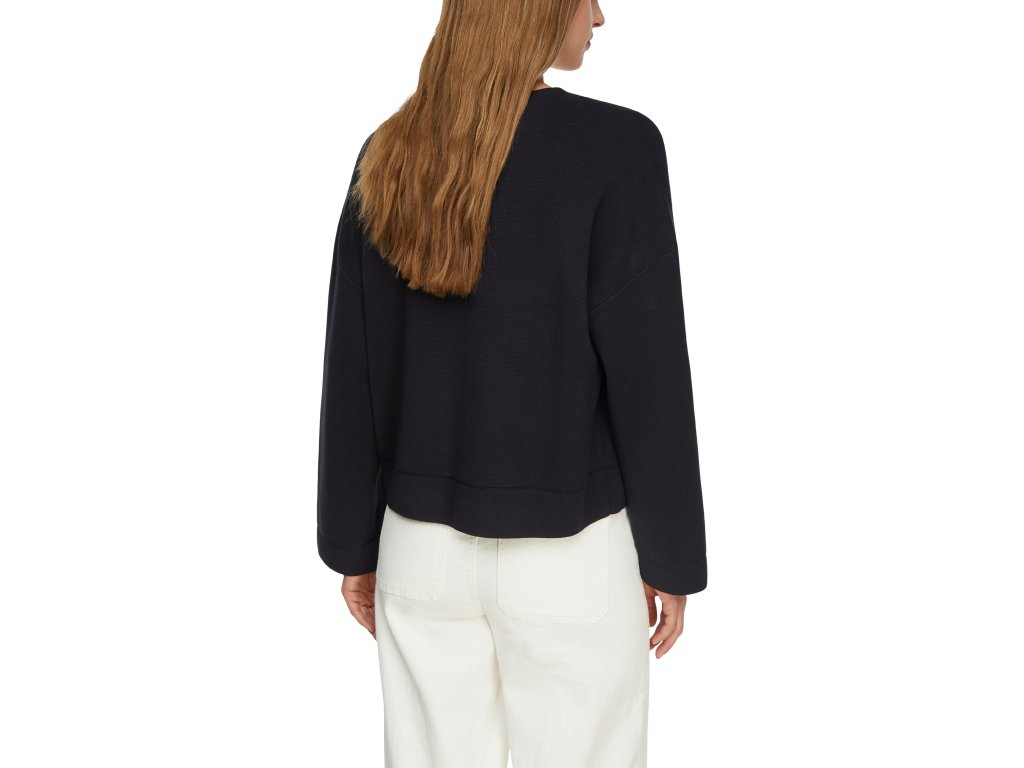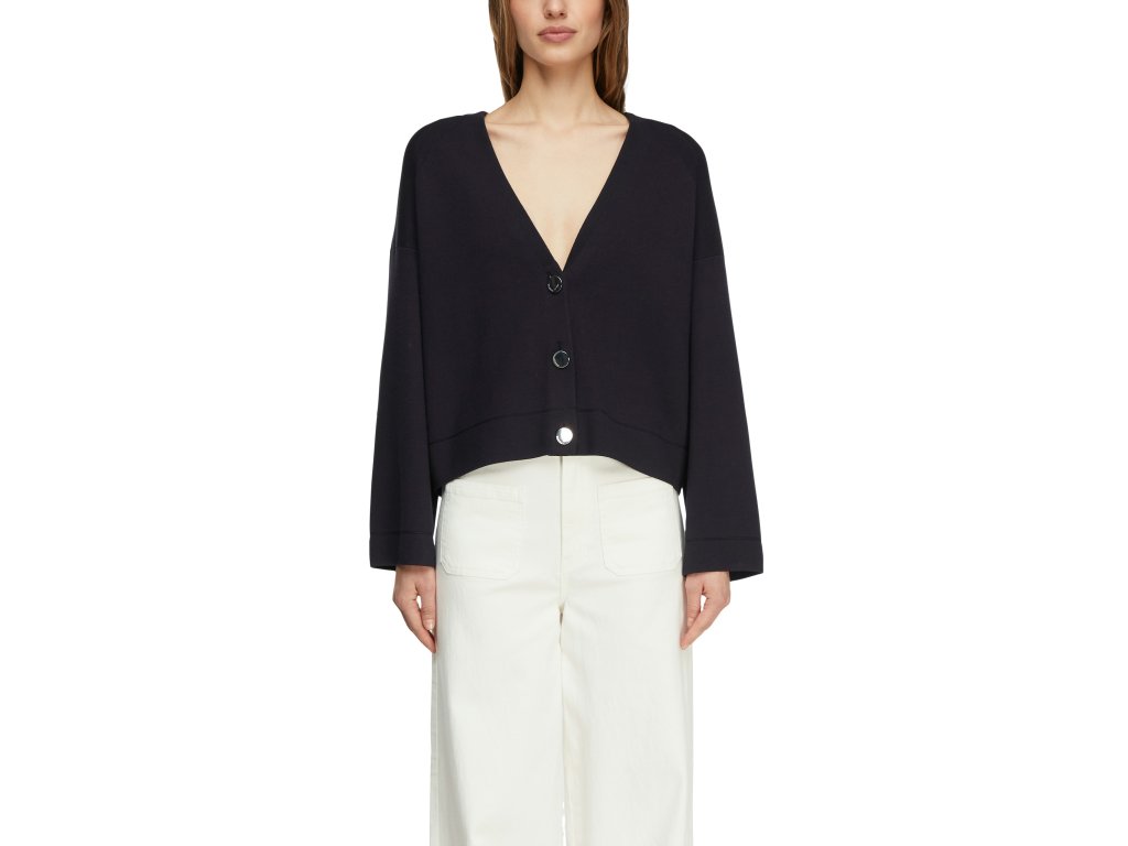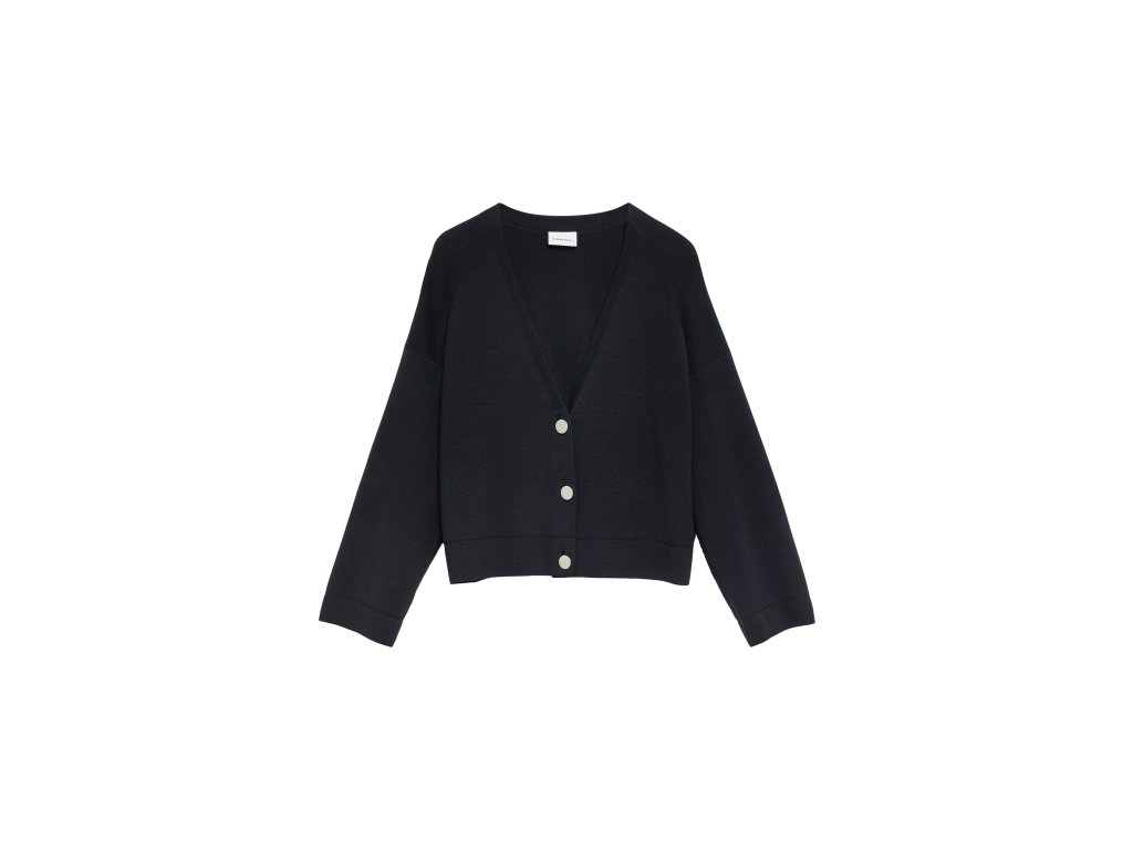 Elegantní dámský kardigan v tmavém odstínu je nadčasovým kouskem, který skvěle doplní každý outfit. Kratší střih a výrazné knoflíky dodávají modelu moderní vzhled, zatímco měkký materiál zajišťuje pohodlí při nošení. Ideální pro vrstvení k šatům, halenkám i topům – jak do práce, tak pro volný čas.