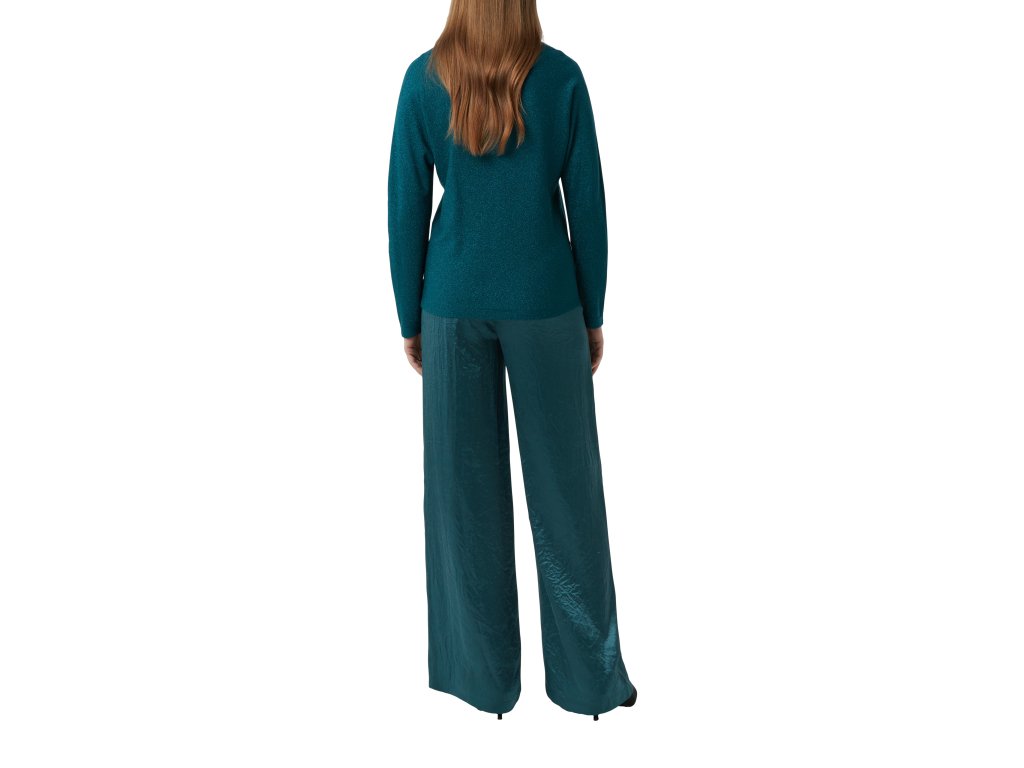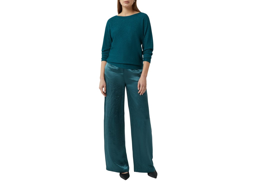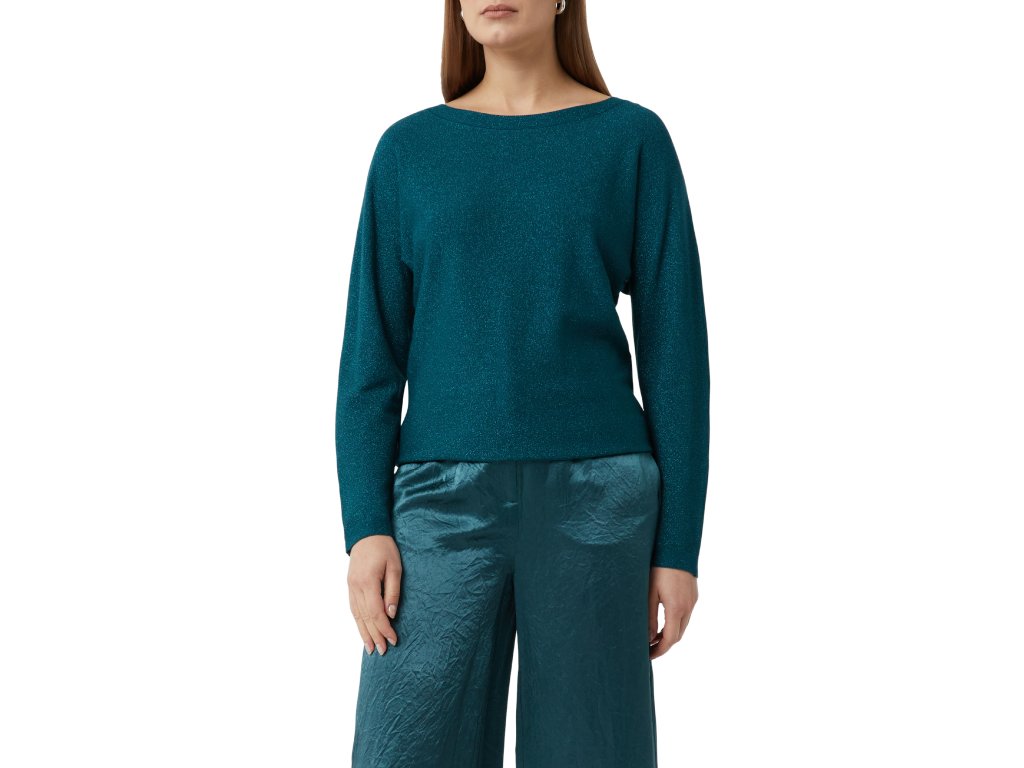 Elegantní svetr v sytém petrolejovém odstínu s jemným metalickým leskem. Díky měkkému úpletu a volnějšímu střihu působí ležérně, ale zároveň sofistikovaně – ideální volba pro stylový denní i večerní look. Lodičkový výstřih dodává modelu ženskost a nadčasovost.