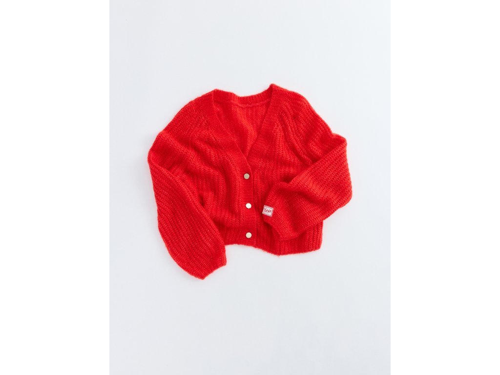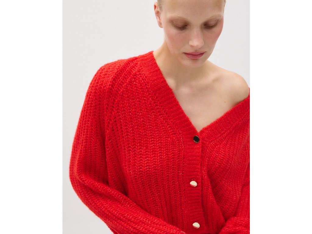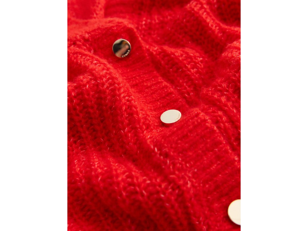 Výrazný pletený kardigan v sytě červeném odstínu je ideálním kouskem pro stylové vrstvení. Kratší střih s výstřihem do V působí žensky a moderně, zatímco měkká strukturovaná pletenina zajišťuje maximální pohodlí při nošení. Kardigan je doplněn knoflíky v elegantním kovovém vzhledu, které dodávají celku sofistikovaný detail. Perfektní volba k šatům, sukním i kalhotám – pro každodenní i výraznější outfit.