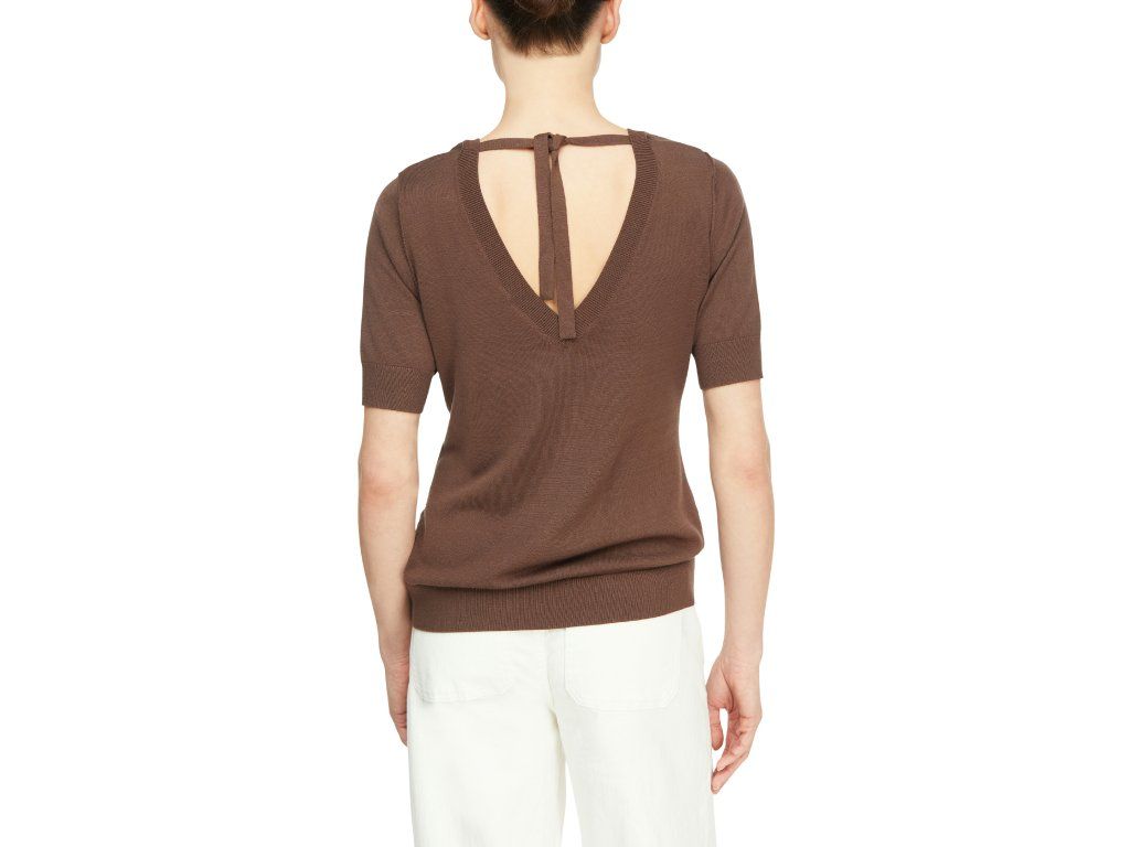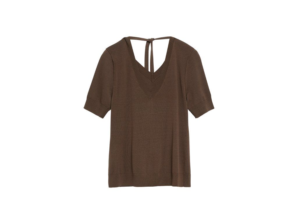 Dámský úpletový top v elegantním hnědém odstínu zaujme svým minimalistickým designem a zajímavým detailem na zádech. Přední část doplňuje jemný výstřih do V, zatímco zadní strana je ozvláštněna hlubším výstřihem se zavazováním, které dodává modelu ženský a originální charakter.