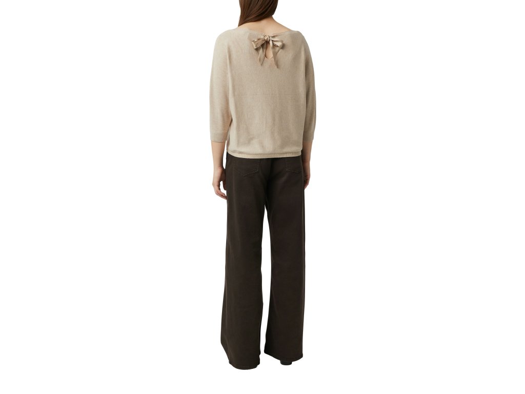 Dámský svetr s jemným, elegantním vzhledem, který zaujme originálním detailem v podobě zavazování za krkem. Lehký a příjemný materiál krásně splývá a poskytuje pohodlí při nošení. Volnější střih a tříčtvrteční rukávy dodávají modelu vzdušnost a ženský charakter. Svetr se skvěle hodí ke kalhotám i sukni a je ideální volbou pro ležérně elegantní i každodenní outfity.