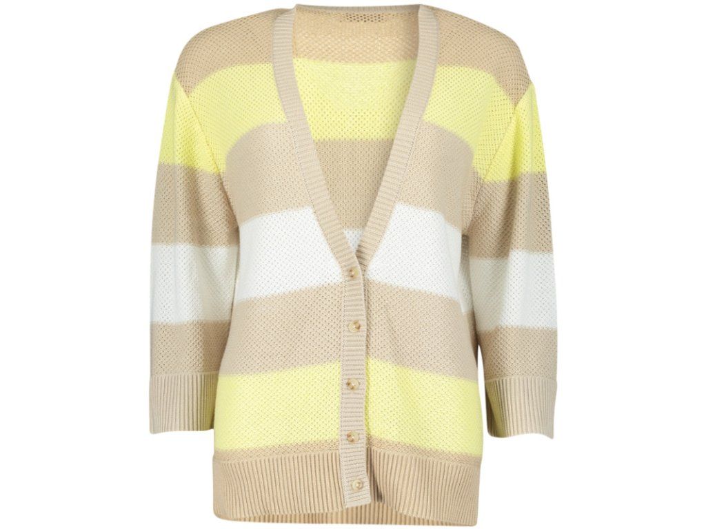 Lehký dámský kardigan v jemných proužcích je ideální volbou pro jarní a letní dny. Kombinace béžových, krémových a svěže žlutých tónů působí svěže a zároveň elegantně. Vzdušná pletená struktura dodává modelu lehkost a zajišťuje maximální pohodlí při nošení.