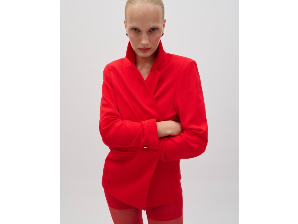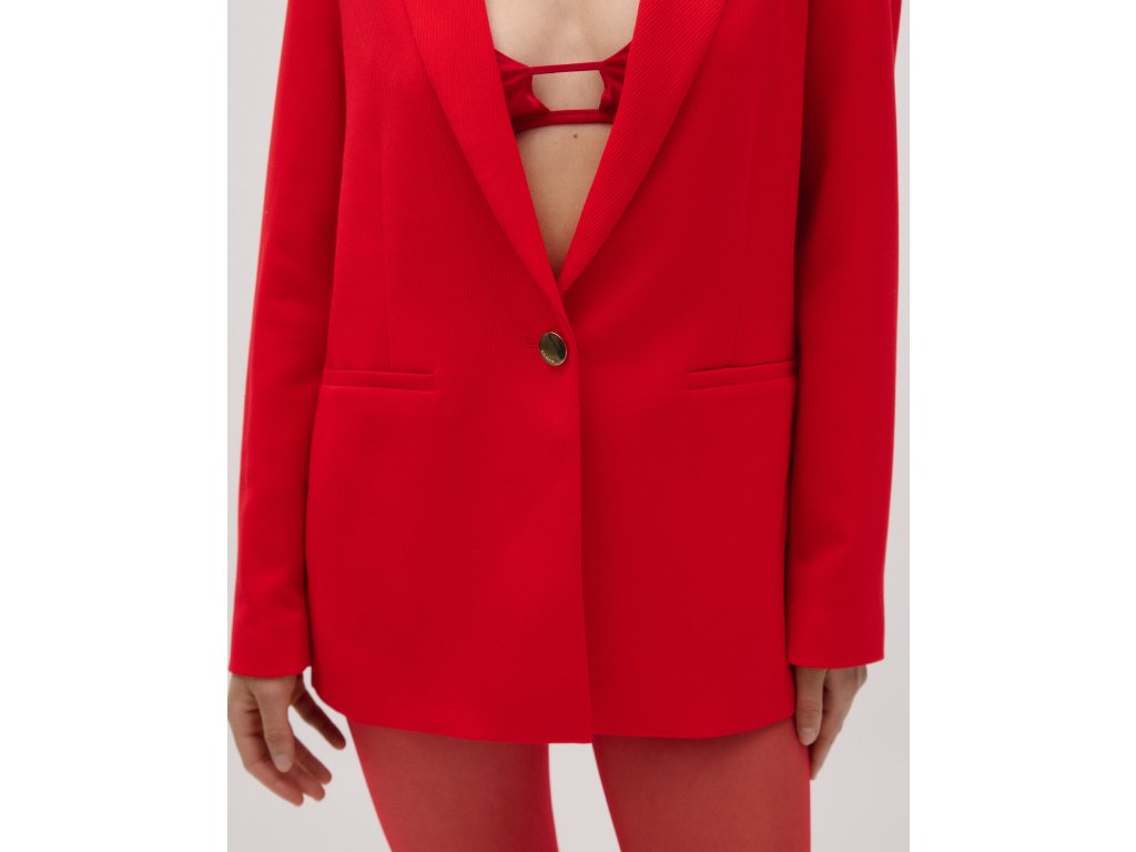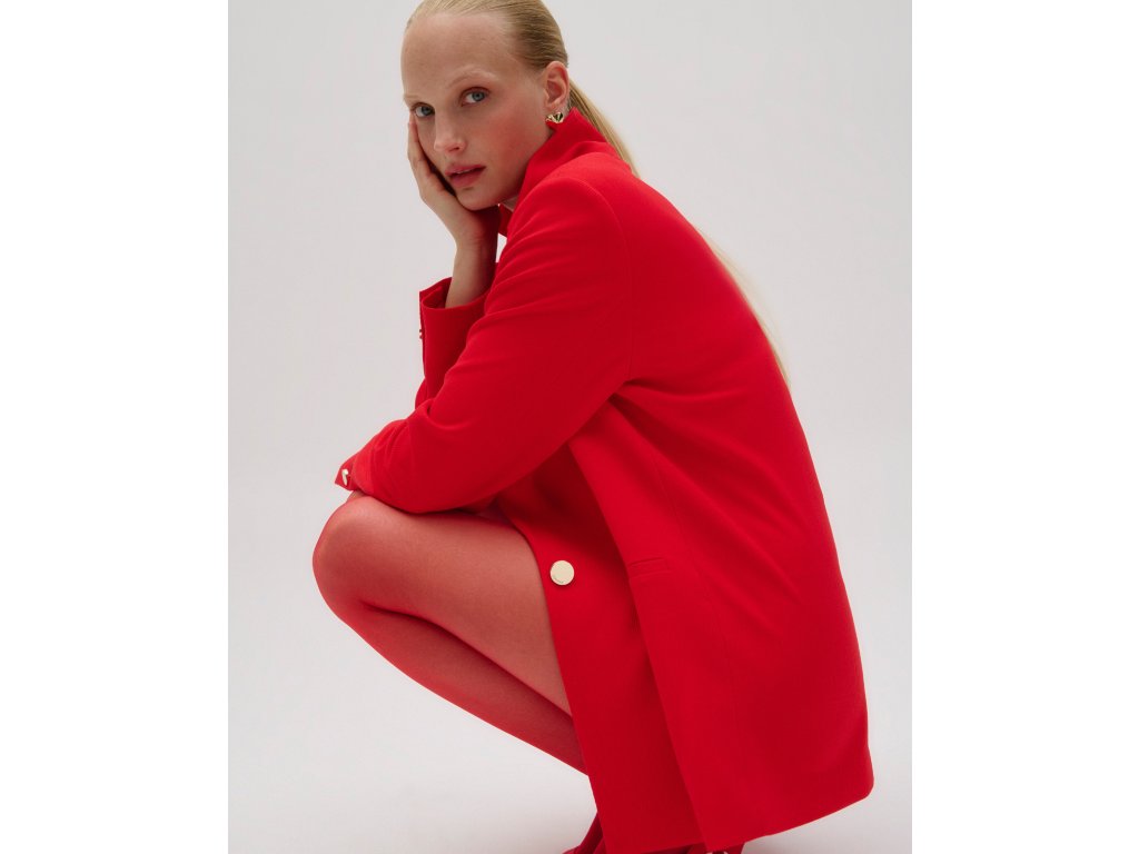 Elegantní dámské sako v sytě červeném odstínu dodá outfitu sebevědomý a moderní výraz. Klasický střih s klopovým límcem je nadčasový a snadno kombinovatelný – hodí se jak k formálním, tak i ležérnějším outfitům. Jemně strukturovaný materiál působí sofistikovaně a zajišťuje komfort při celodenním nošení. Stylový knoflík v kovovém vzhledu podtrhuje čistý a ženský design saka.