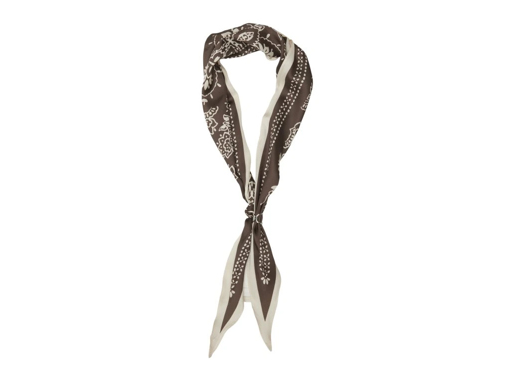 Stylový šátek v hnědo-krémové kombinaci s jemným dekorativním vzorem je ideálním doplňkem pro oživení každého outfitu. Elegantní barevné provedení působí vkusně a snadno se kombinuje s dalšími kousky. Lehký materiál zajišťuje příjemné nošení a variabilitu stylingu.