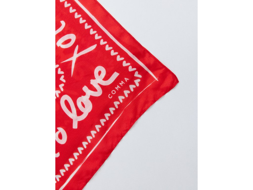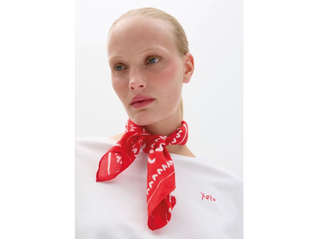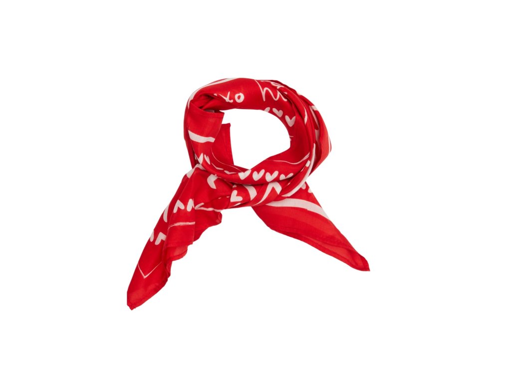 Stylový šátek s hravým srdíčkovým motivem v sytě červené barvě dodá každému outfitu výrazný akcent. Jemný, lehký materiál se příjemně nosí a umožňuje variabilní styling – kolem krku, do vlasů, na kabelku nebo jako detail k saku či kabátu. Ideální doplněk, který vnese do každodenního looku špetku romantiky i sebevědomí.