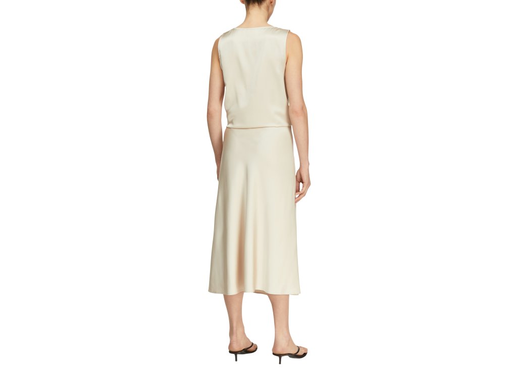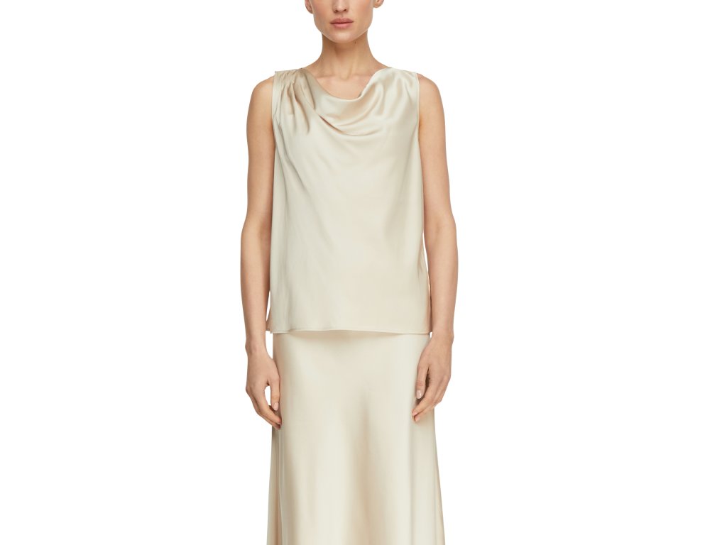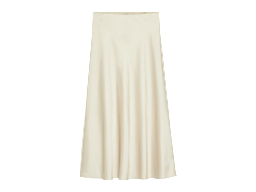 Elegantní saténová sukně v jemném béžovém odstínu je ztělesněním nadčasové ženskosti. Hladký, lehce lesklý materiál působí luxusně a krásně splývá podél postavy, čímž vytváří jemnou, přirozenou siluetu.